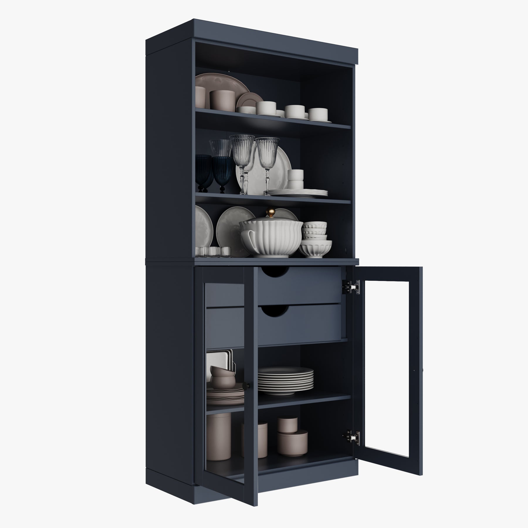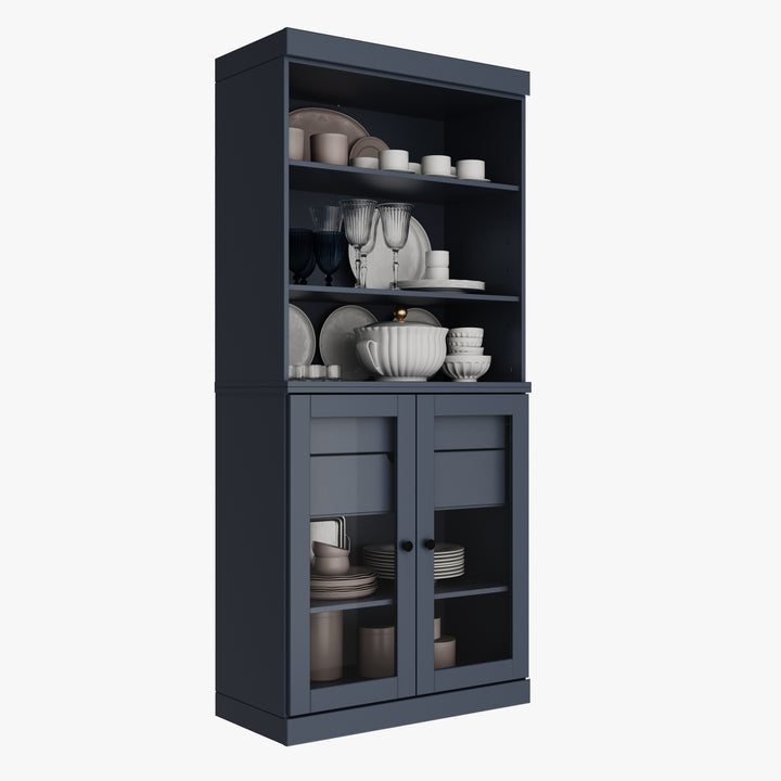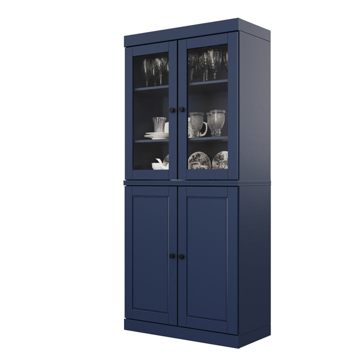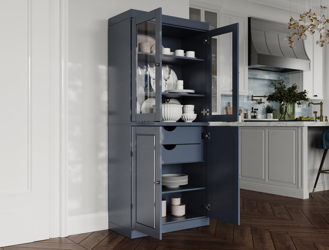 A sophisticated blend of glass and raised panel doors lets you put your favorite wares on display while keeping everyday essentials tucked neatly out of sight. Inside, four adjustable shelves offer generous, flexible storage—ideal for everything from oversized dry goods to a growing spice collection. Two drawers on metal glides provide the perfect hiding place for linens, utensils, or treasured recipe cards.