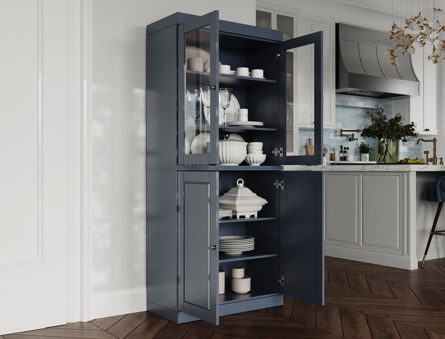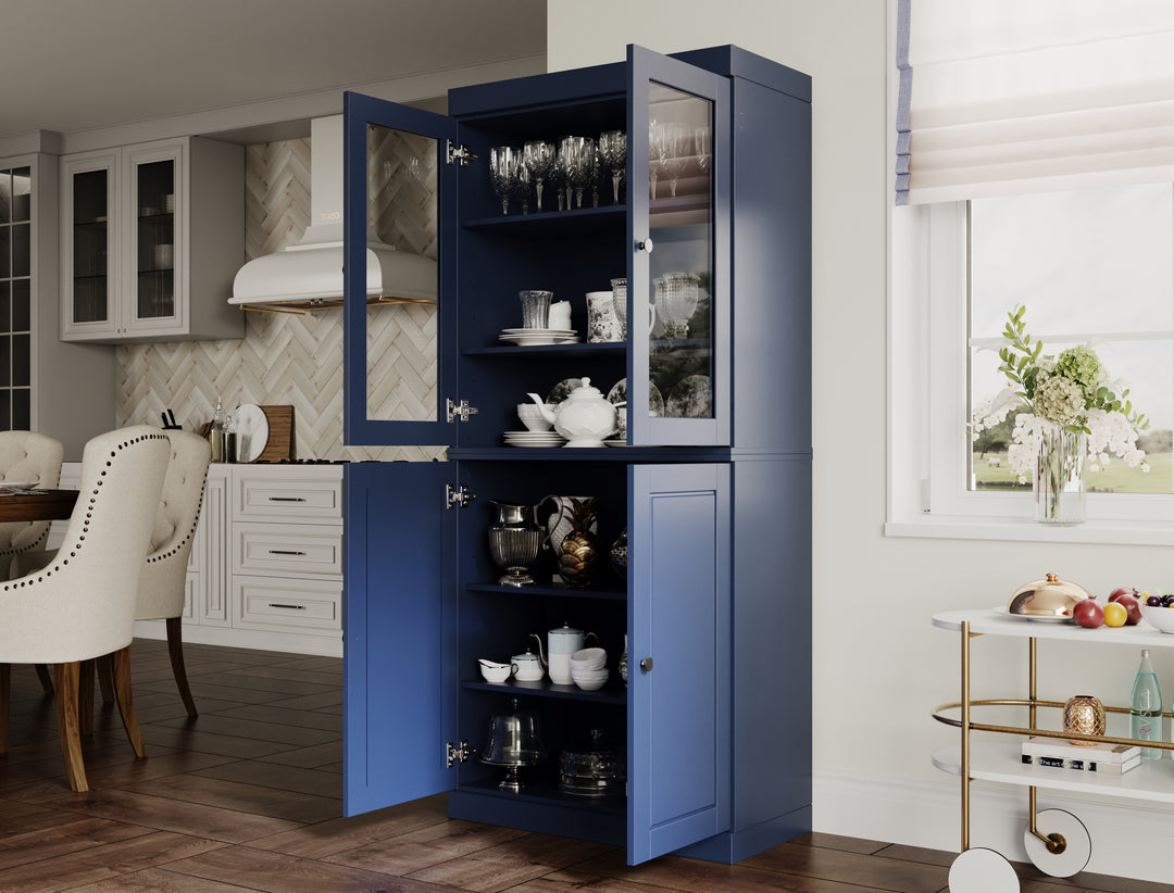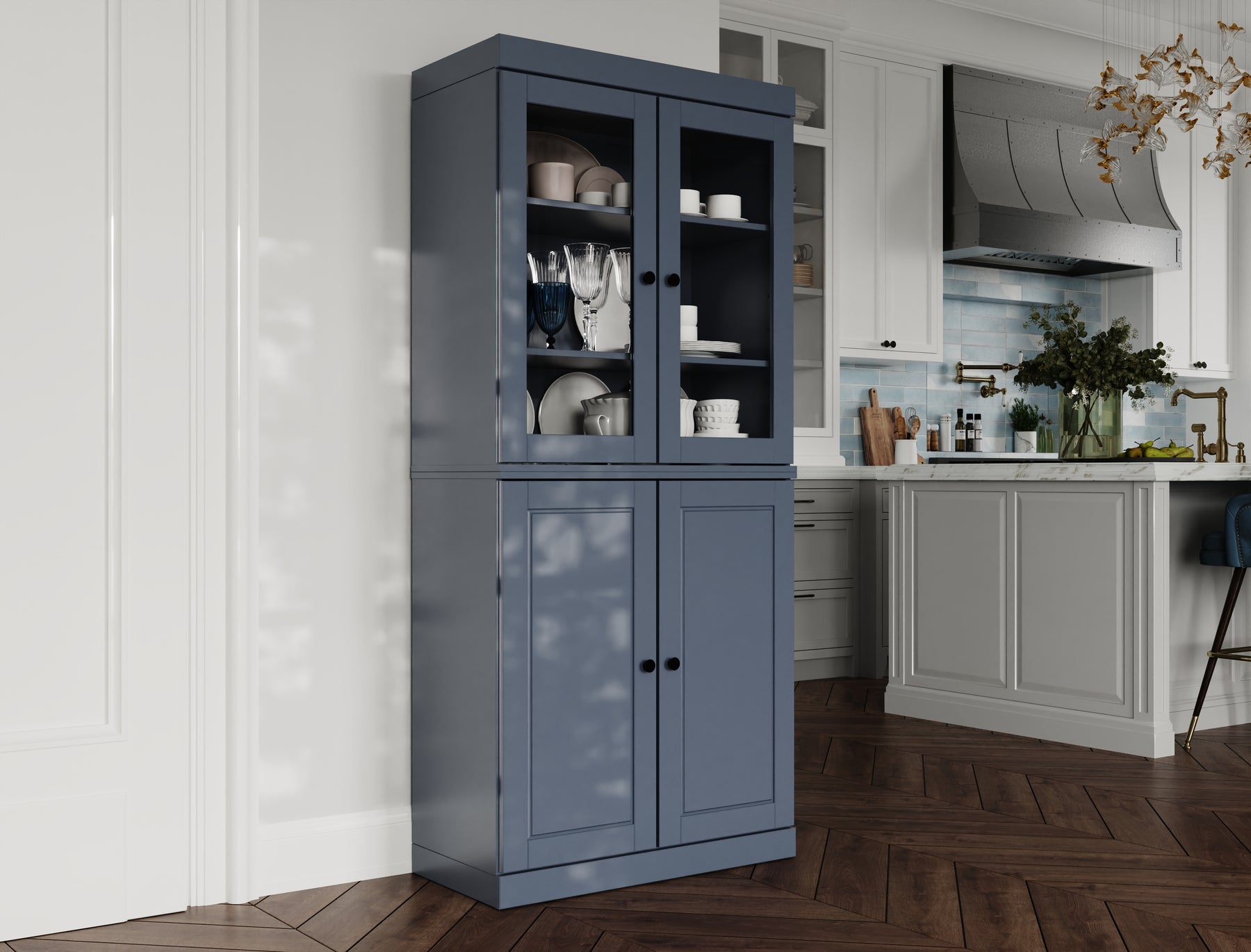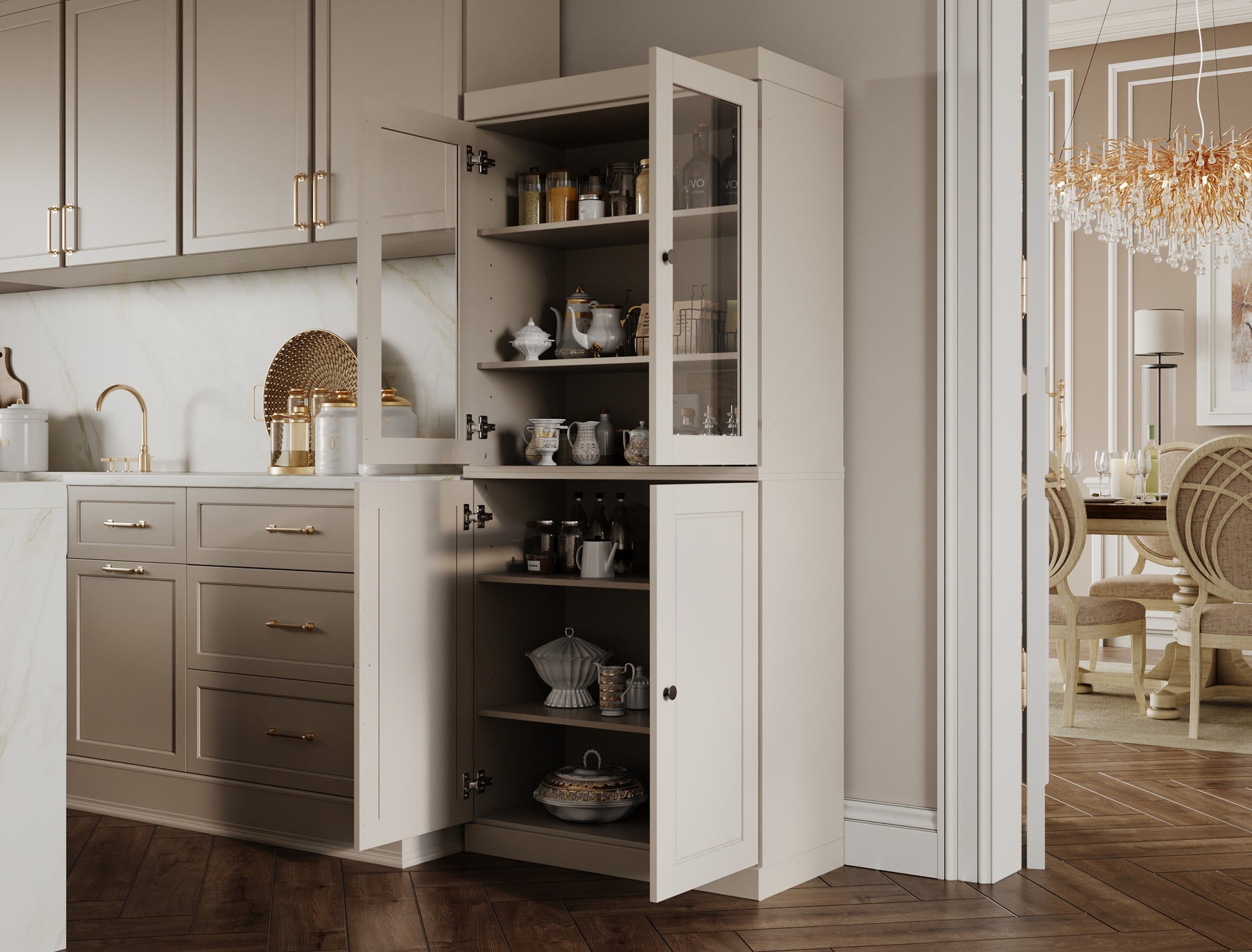 A thoughtful mix of glass and raised panel doors allows you to showcase treasured items while neatly concealing the rest. Inside, four adjustable shelves provide generous, customizable storage—perfect for oversized dry goods, spices, and everything in between.