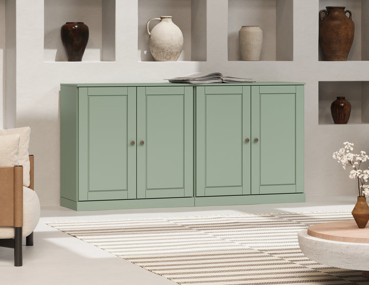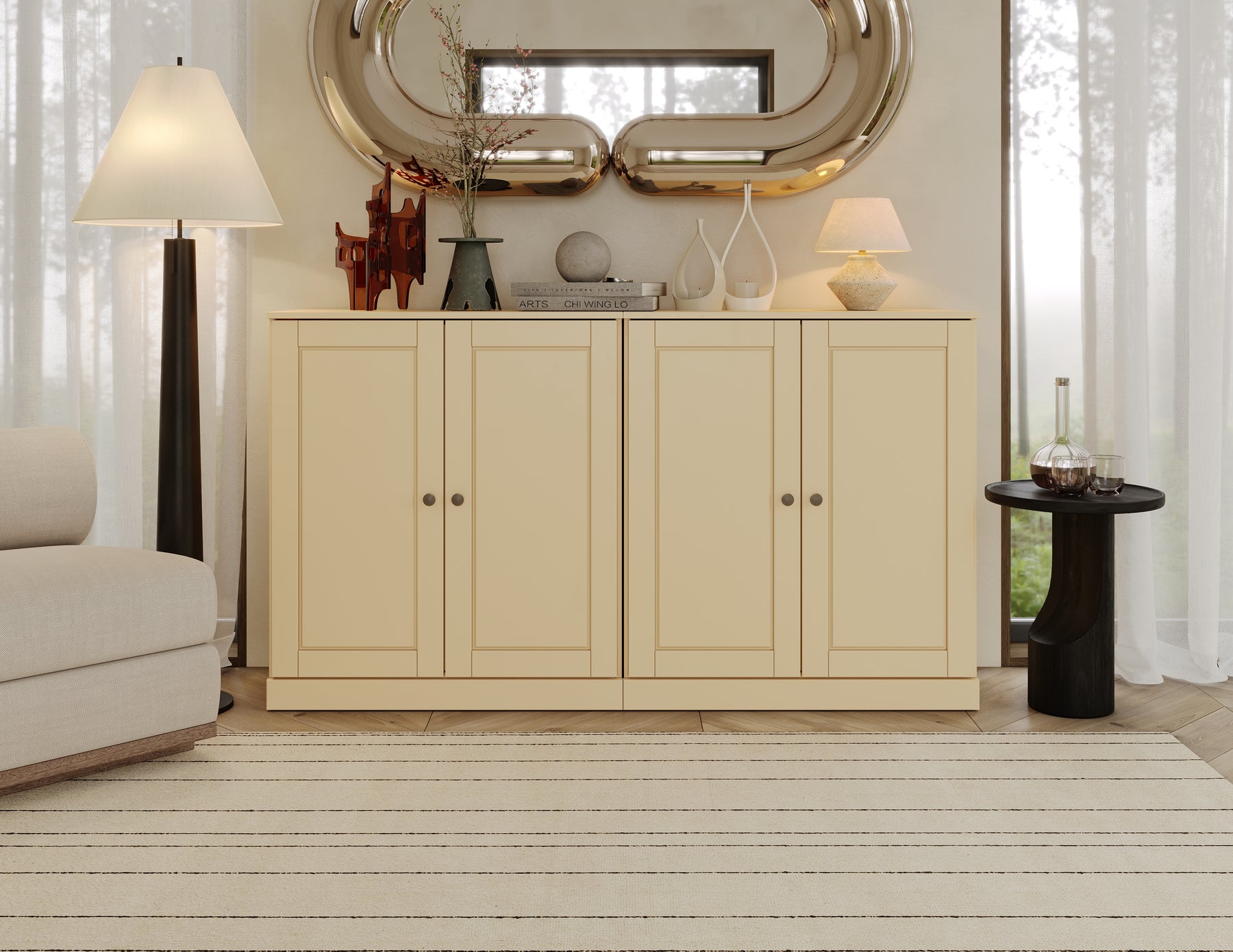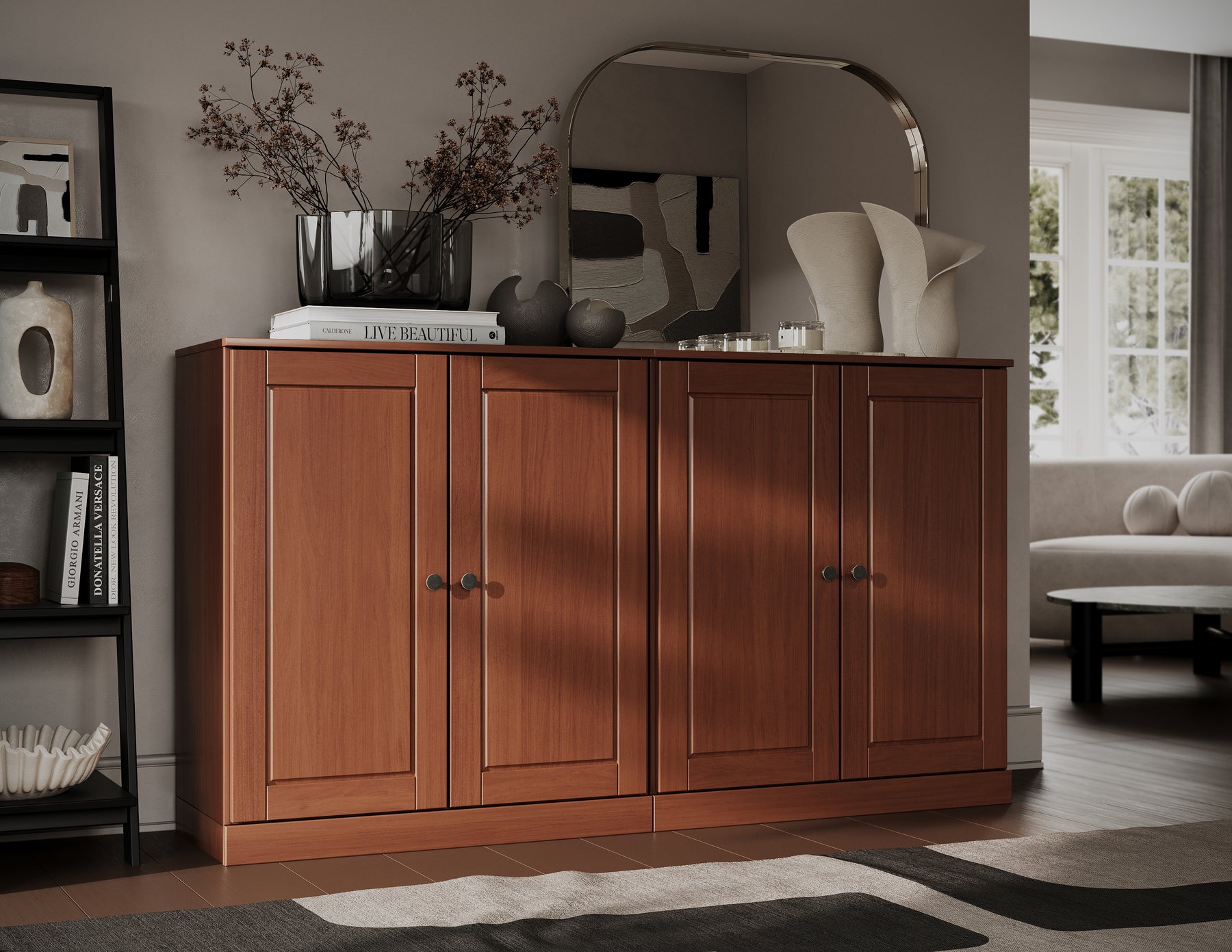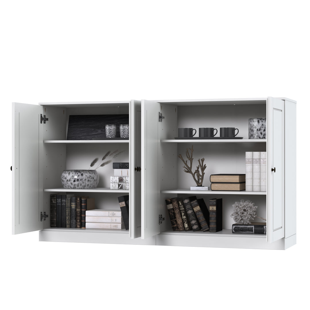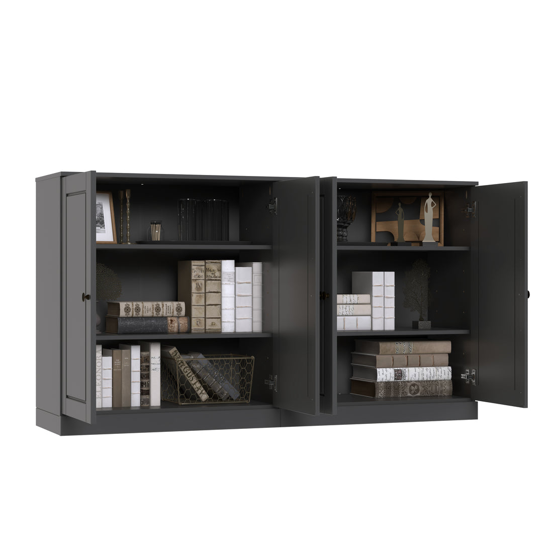 A beautiful 100% Solid Wood Sideboard will be a welcome addition to any room in need of some accent furniture. Cleverly designed as a set of 2 separate units, they can be combined to create a grand 64-inch-wide sideboard or be kept separate for more strategic placement. Fully adjustable and removable 4 shelves inside the voluminous interior make it easy to fit large and small items that can be hidden behind the raised panel doors. Get this Made in Brazil beauty today and enjoy the smell and look of wood for life!