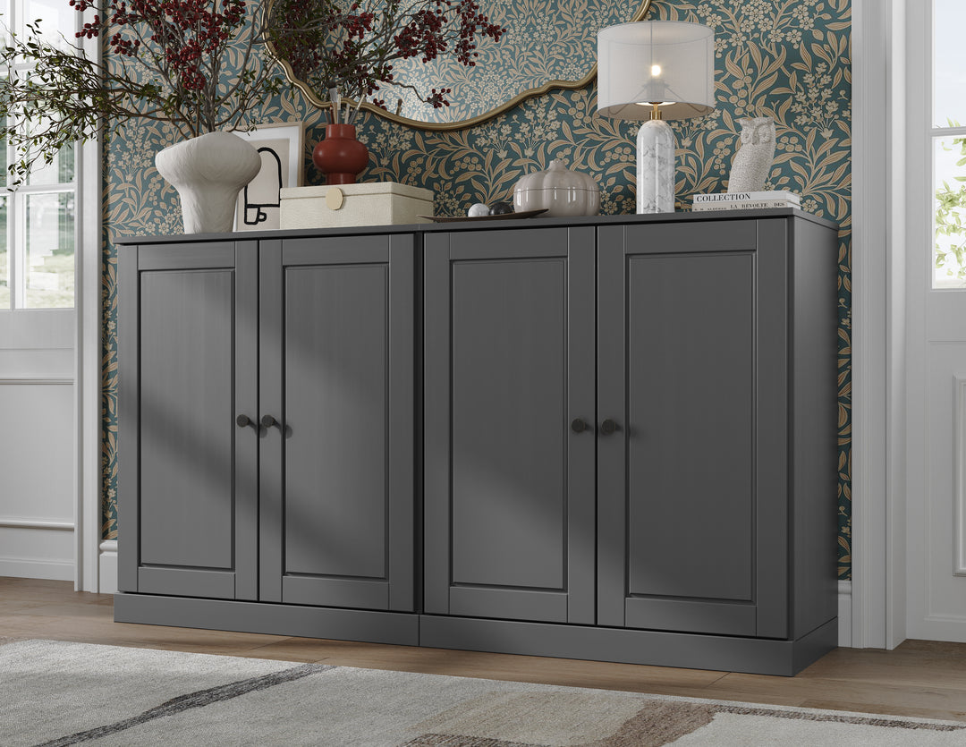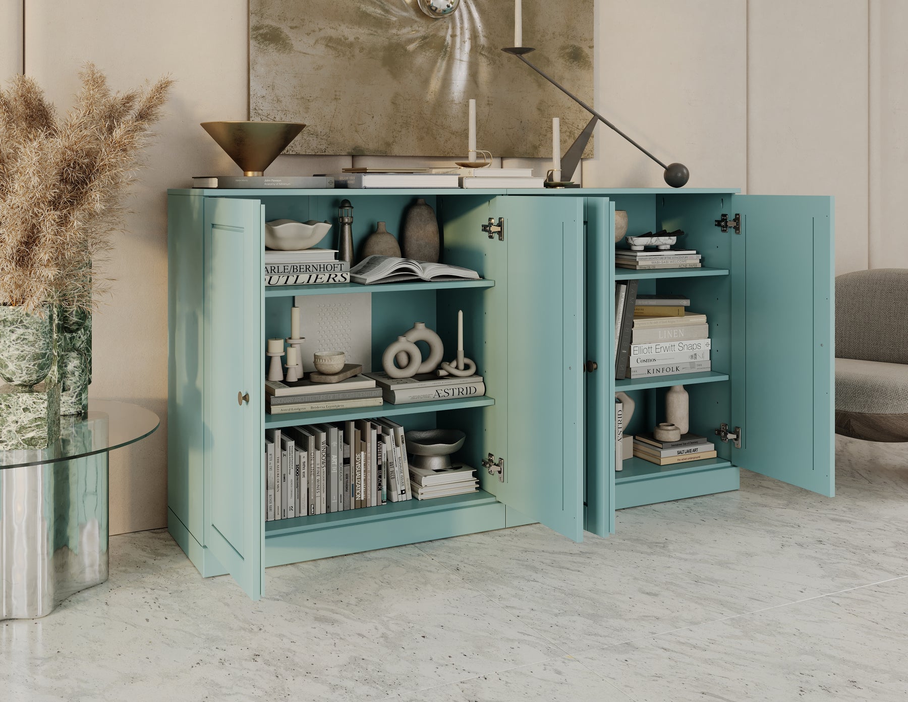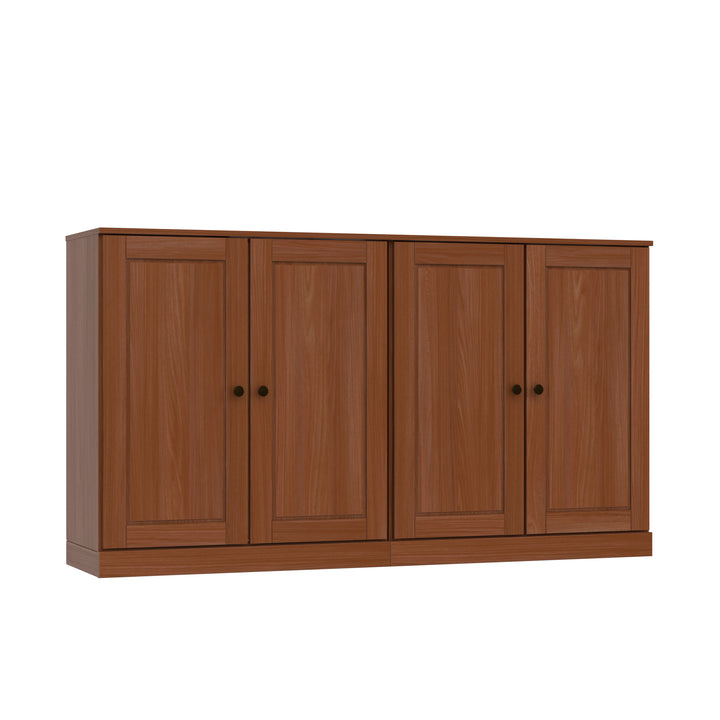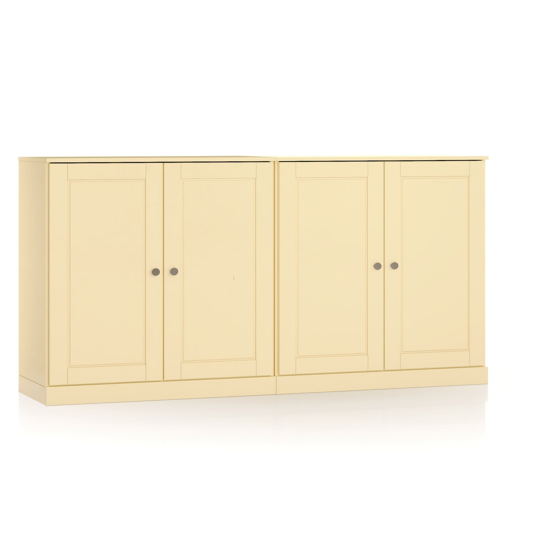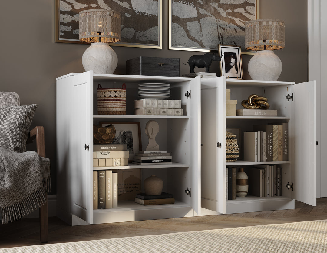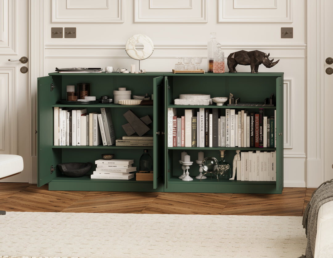 A beautiful 100% Solid Wood Sideboard will be a welcome addition to any room in need of some accent furniture. Cleverly designed as a set of 2 separate units, they can be combined to create a grand 64-inch-wide sideboard or be kept separate for more strategic placement. Fully adjustable and removable 4 shelves inside the voluminous interior make it easy to fit large and small items that can be hidden behind the raised panel doors. Get this Made in Brazil beauty today and enjoy the smell and look of wood for life!