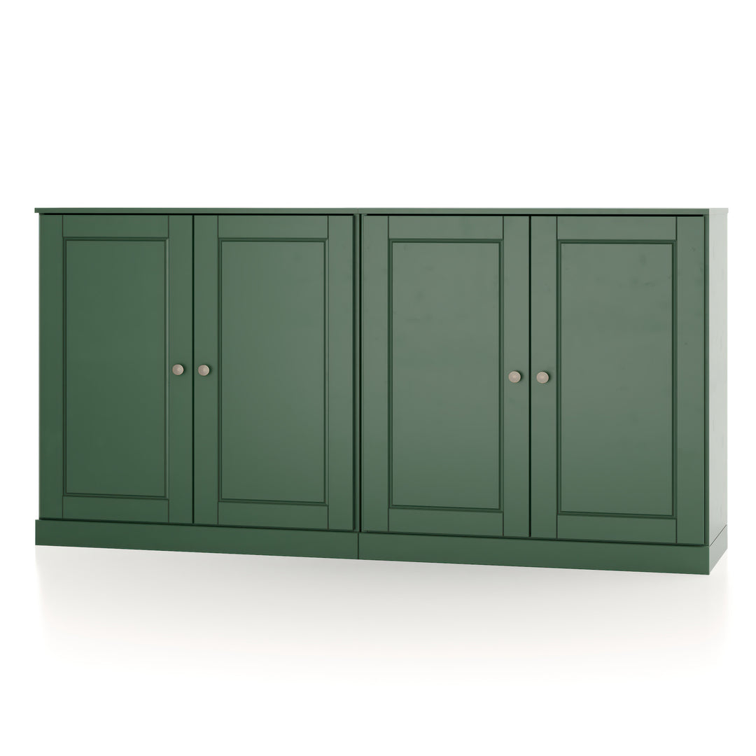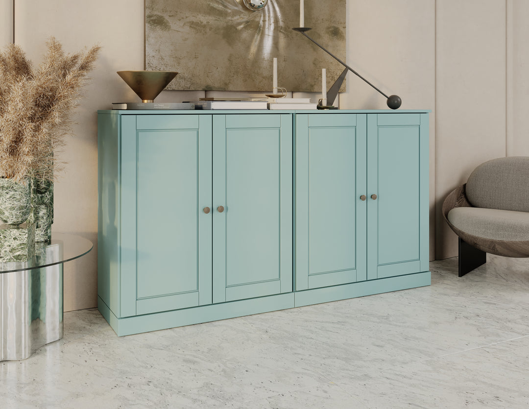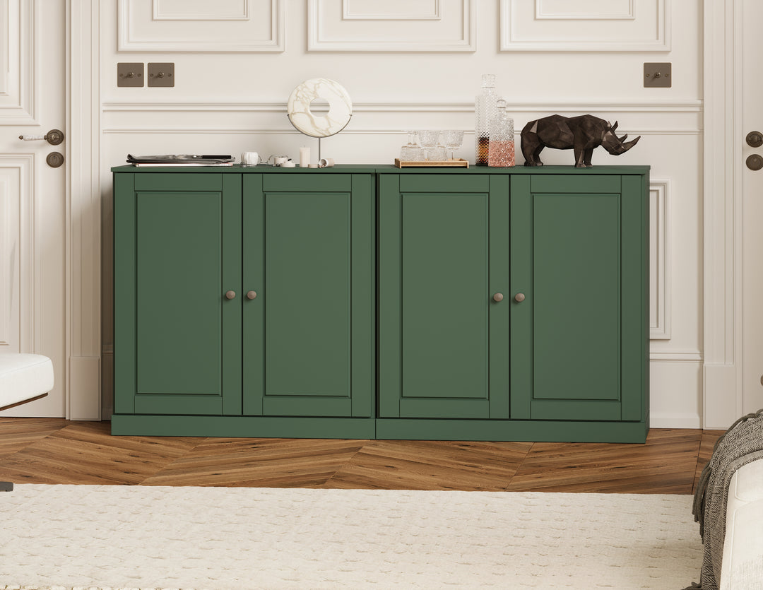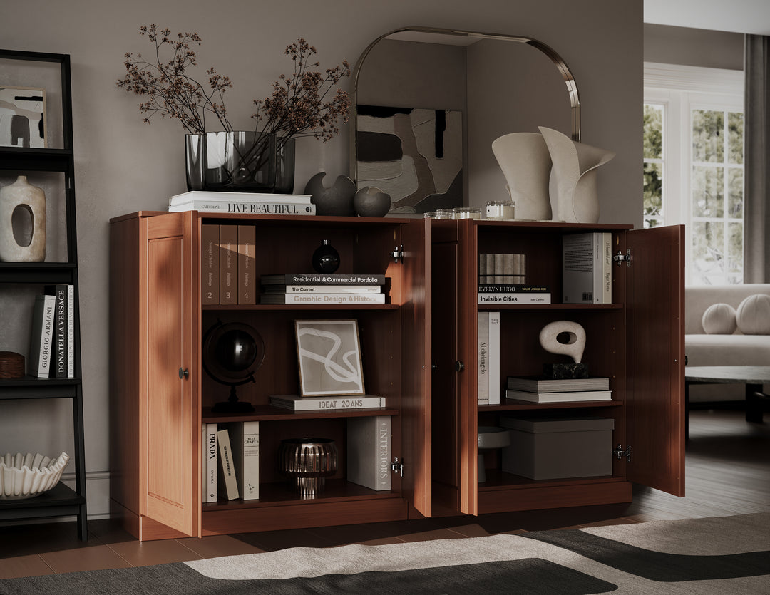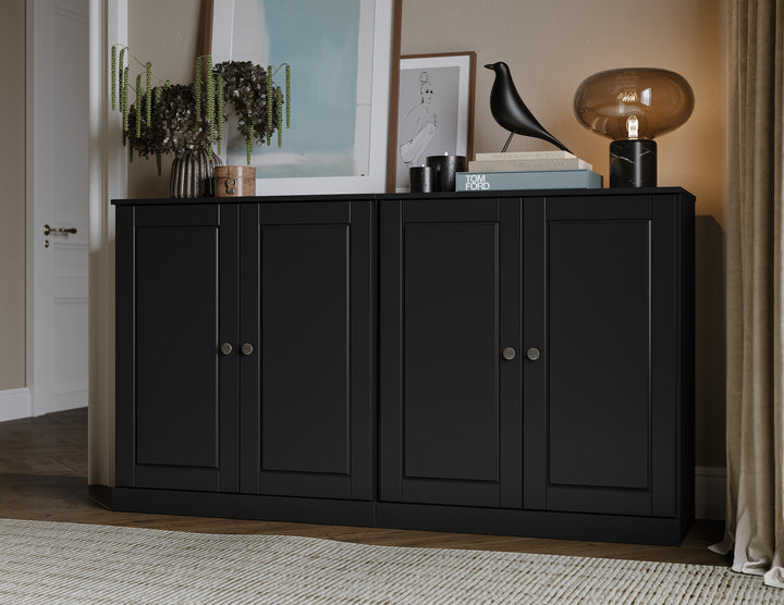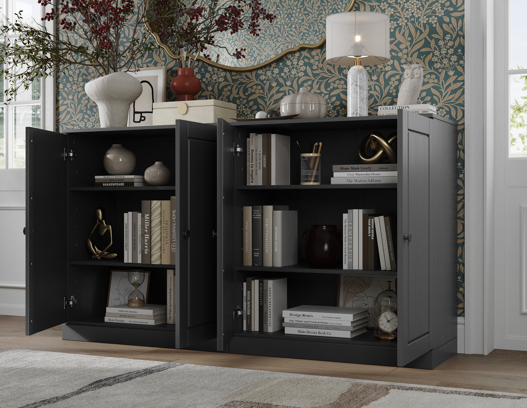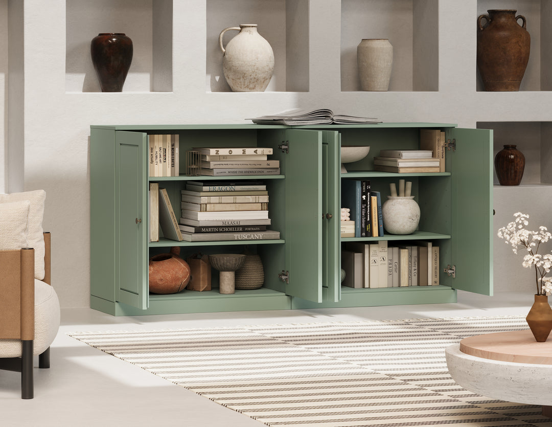 A beautiful 100% Solid Wood Sideboard will be a welcome addition to any room in need of some accent furniture. Cleverly designed as a set of 2 separate units, they can be combined to create a grand 64-inch-wide sideboard or be kept separate for more strategic placement. Fully adjustable and removable 4 shelves inside the voluminous interior make it easy to fit large and small items that can be hidden behind the raised panel doors. Get this Made in Brazil beauty today and enjoy the smell and look of wood for life!