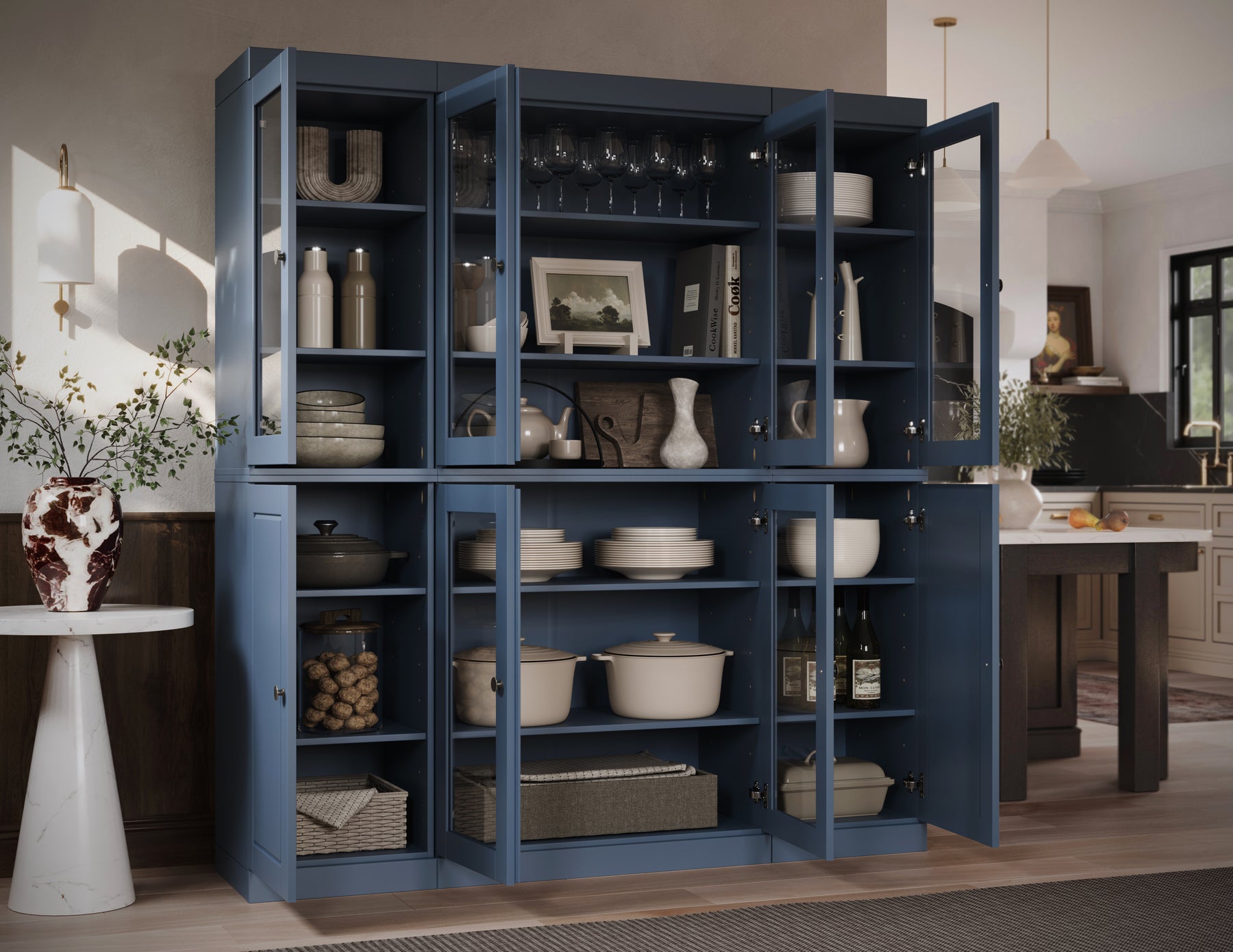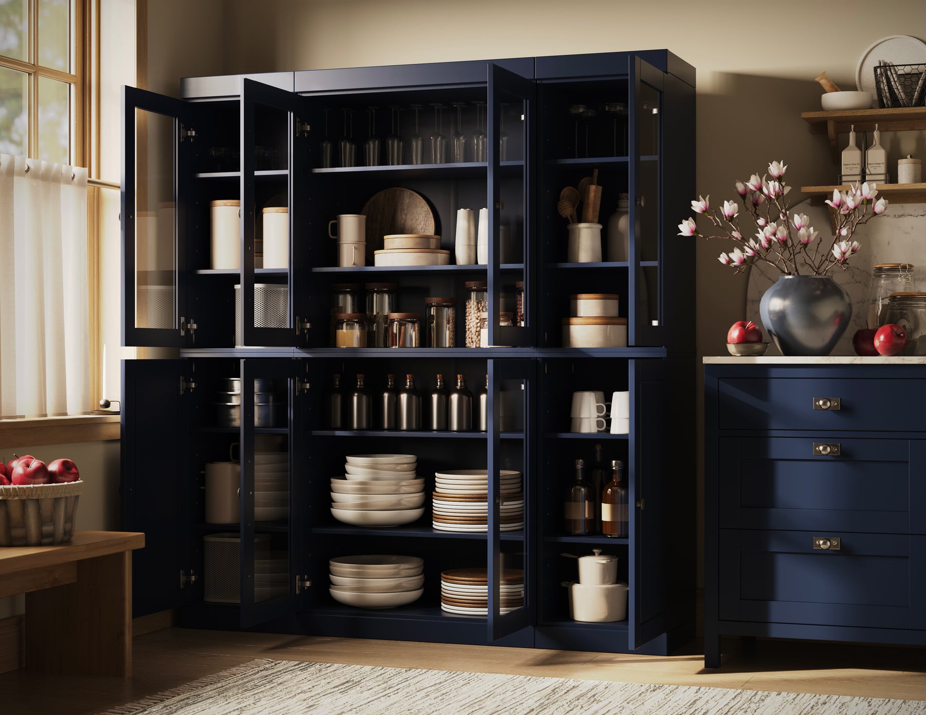 This 100% solid wood 65"‐wide pantry is a perfect solution to your kitchen storage needs! Within easy reach and with 4 large and 8 small adjustable shelves it will allow you to store multiple items regardless of their size. Clear glass doors will showcase your wares while the raised panel solid wood doors will make your pantry look stately no matter an occasional clutter. A 2-drawer organizer is sold separately and is perfect for the smaller loose items. More than one kit can be installed in the same unit. Get this Made in Brazil pantry today to make your kitchen sparkle!