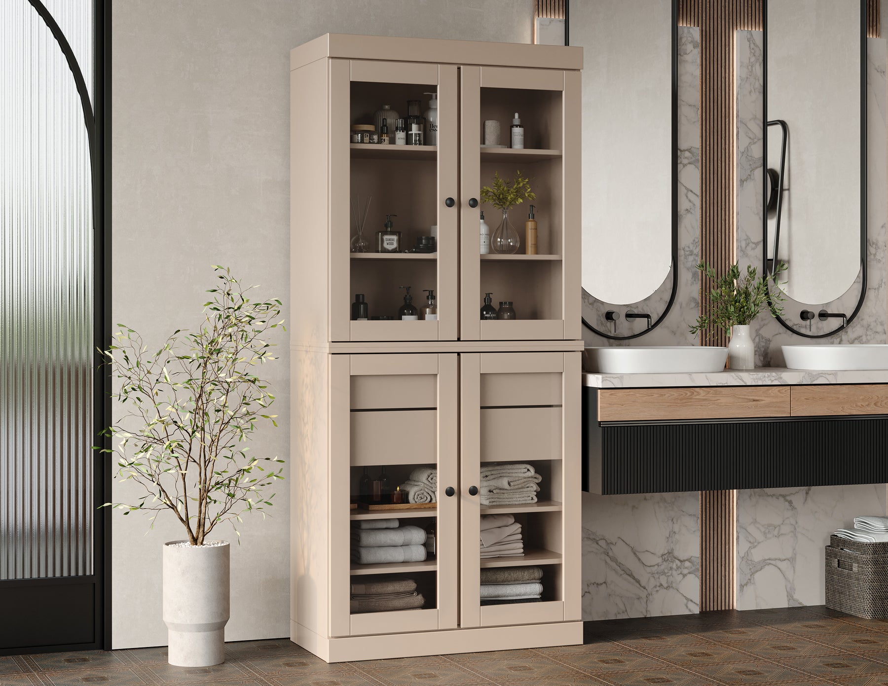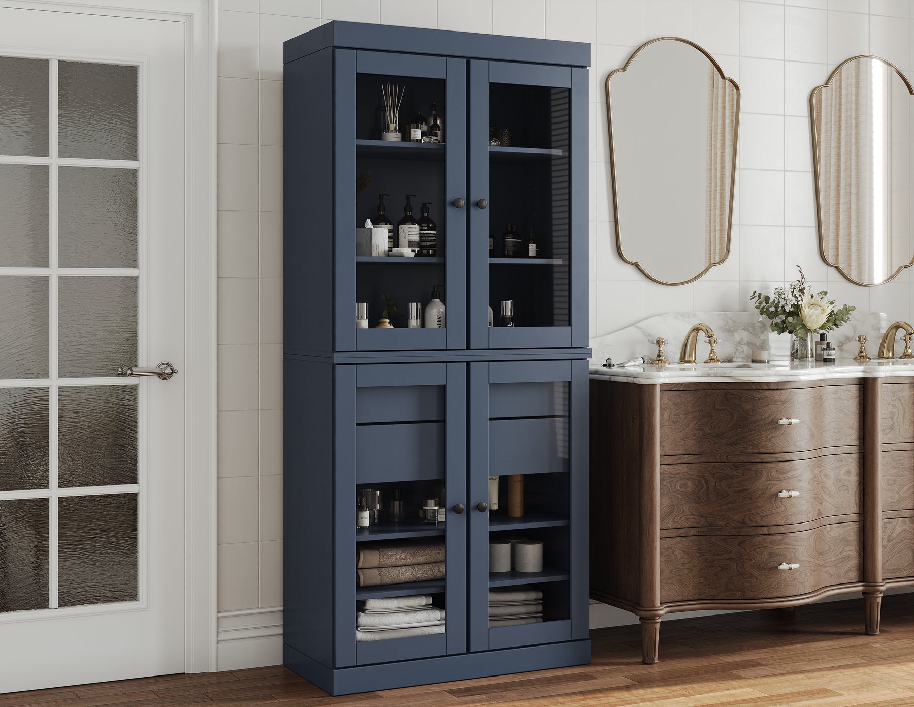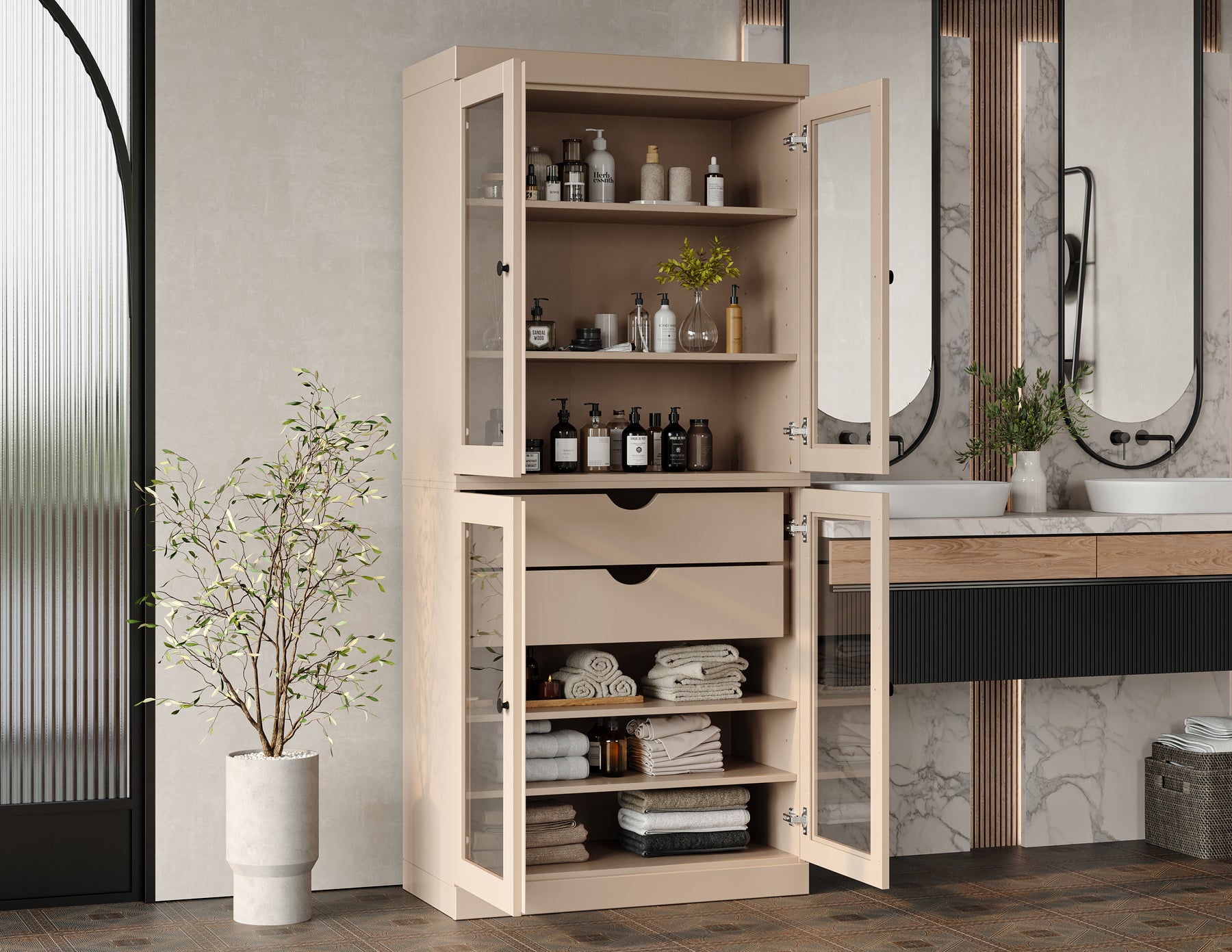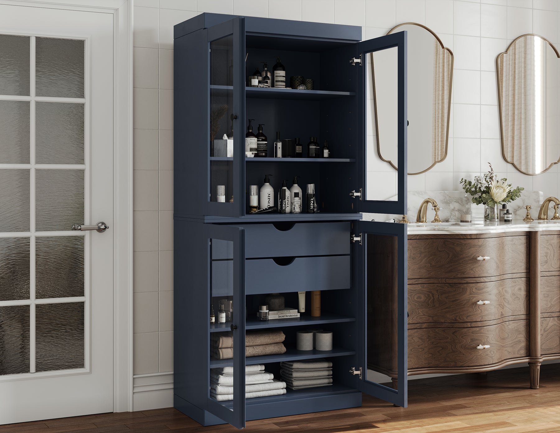 Elevate your bathroom with our 32" wide cabinet, meticulously crafted from 100% solid wood in Brazil. This versatile piece features adjustable shelves, allowing you to personalize storage and keep your space organized. The cabinet comes with clear glass doors to elegantly display your items, with additional door options available separately. Choose from frosted glass for a modern touch or solid wood doors for sleek, concealed storage. A 2-drawer organizer kit is included, ideal for small essentials, with the option to add more kits (sold separately) for enhanced organization. Combining timeless style with lasting durability, this cabinet is designed to bring both elegance and functionality to your bathroom.