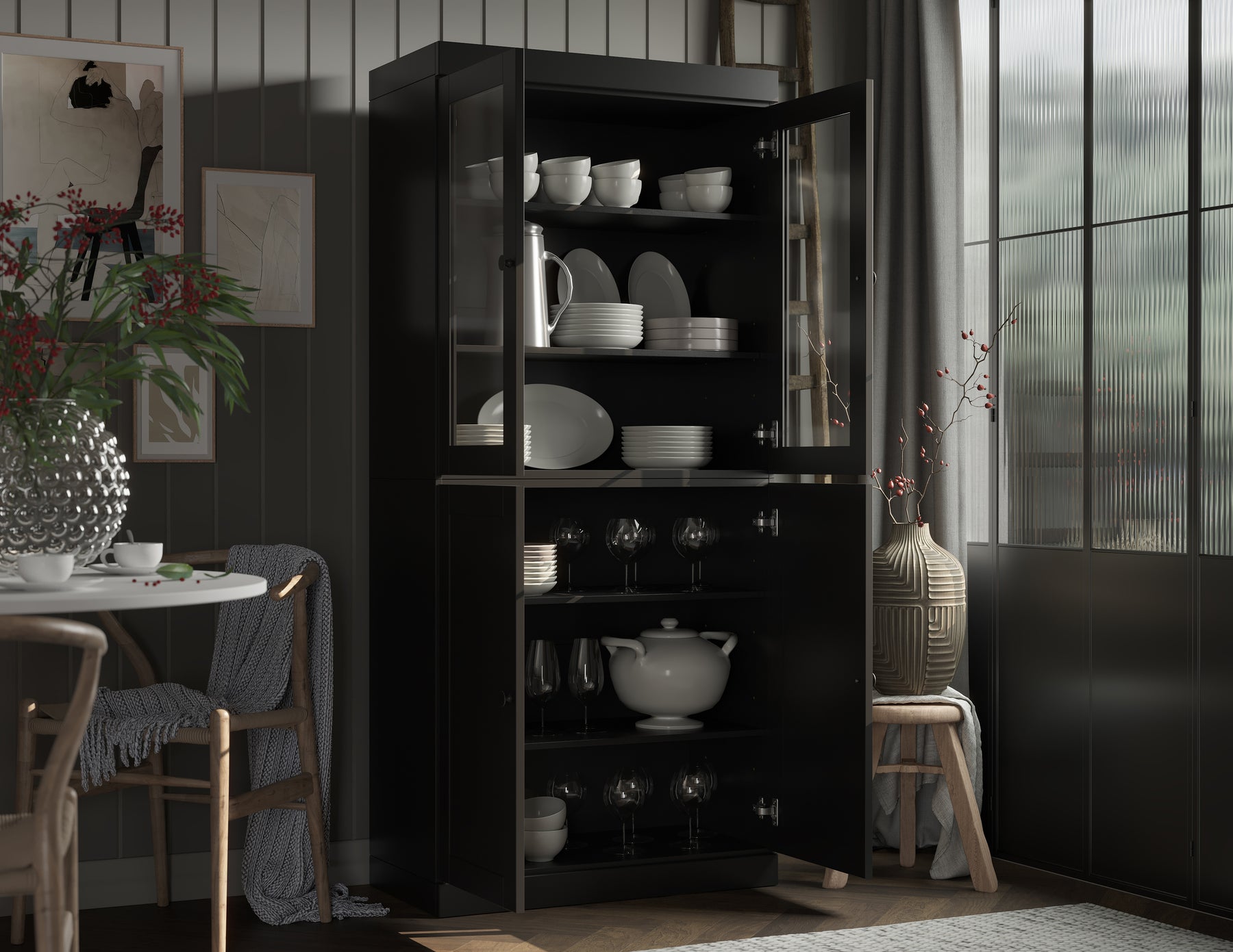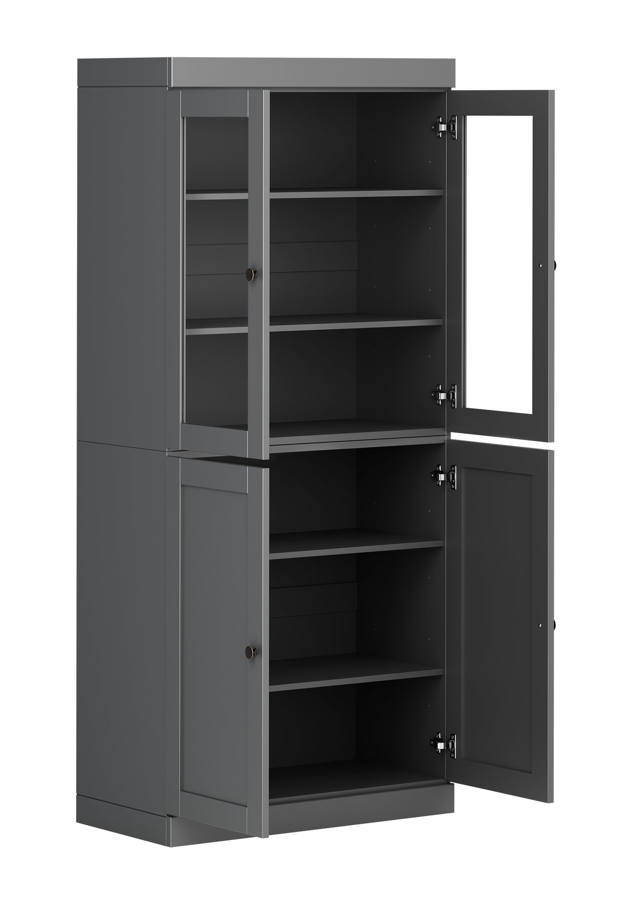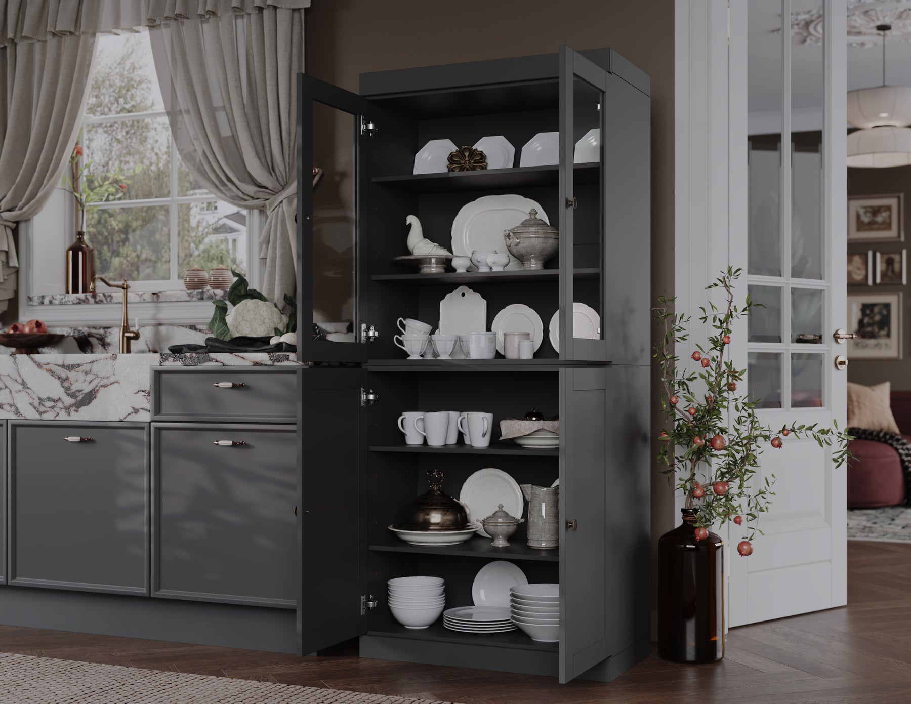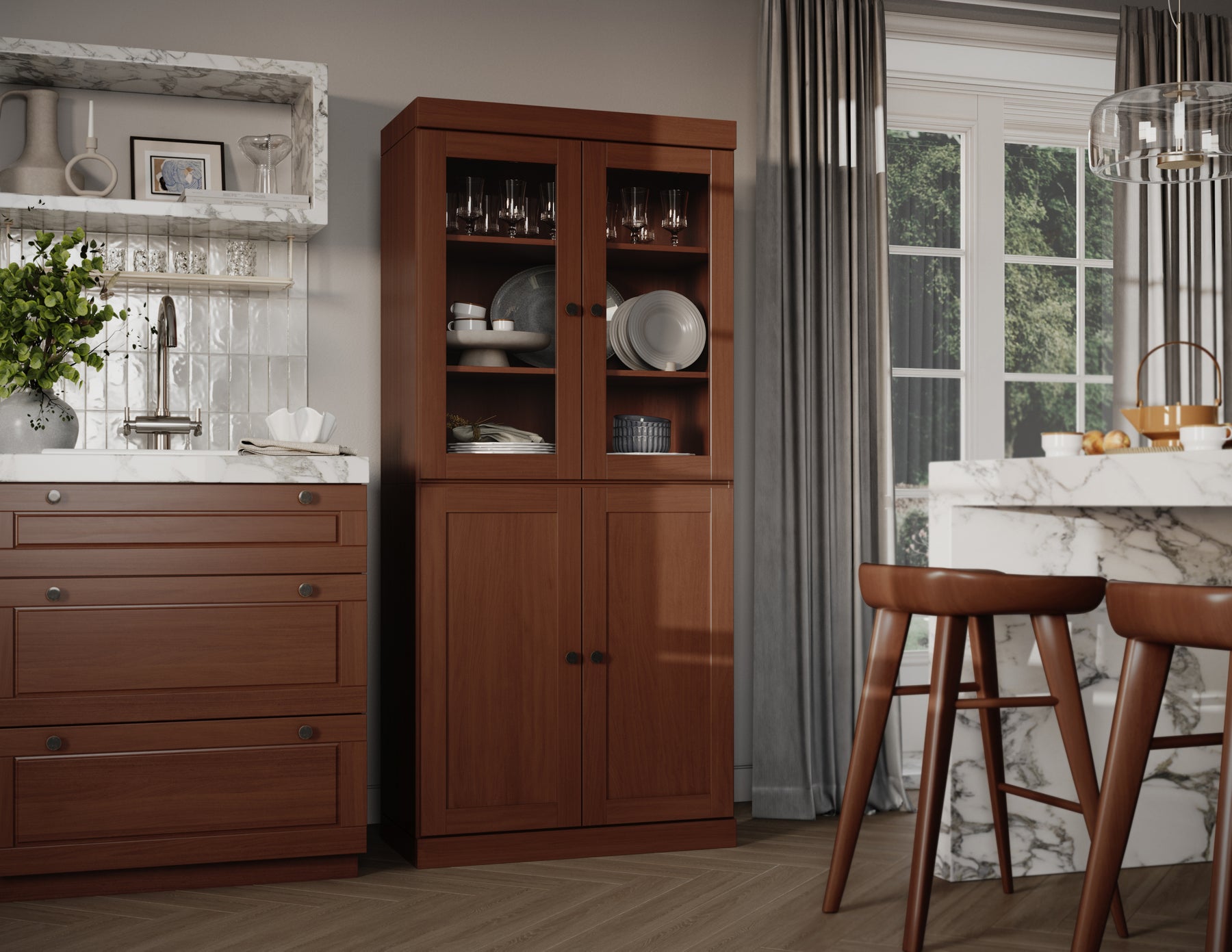 Keep your kitchen organized with our 32"-wide pantry, crafted in Brazil from 100% solid wood. The top features clear glass, ideal for showcasing your favorite items, while the bottom section includes classic shaker doors for hidden storage of pantry essentials and kitchenware. Adjustable shelves allow for flexible storage to meet your needs.