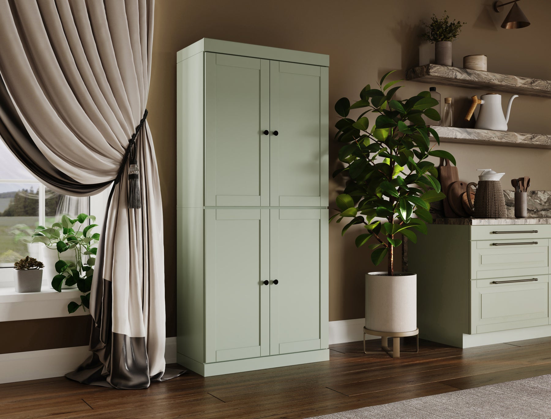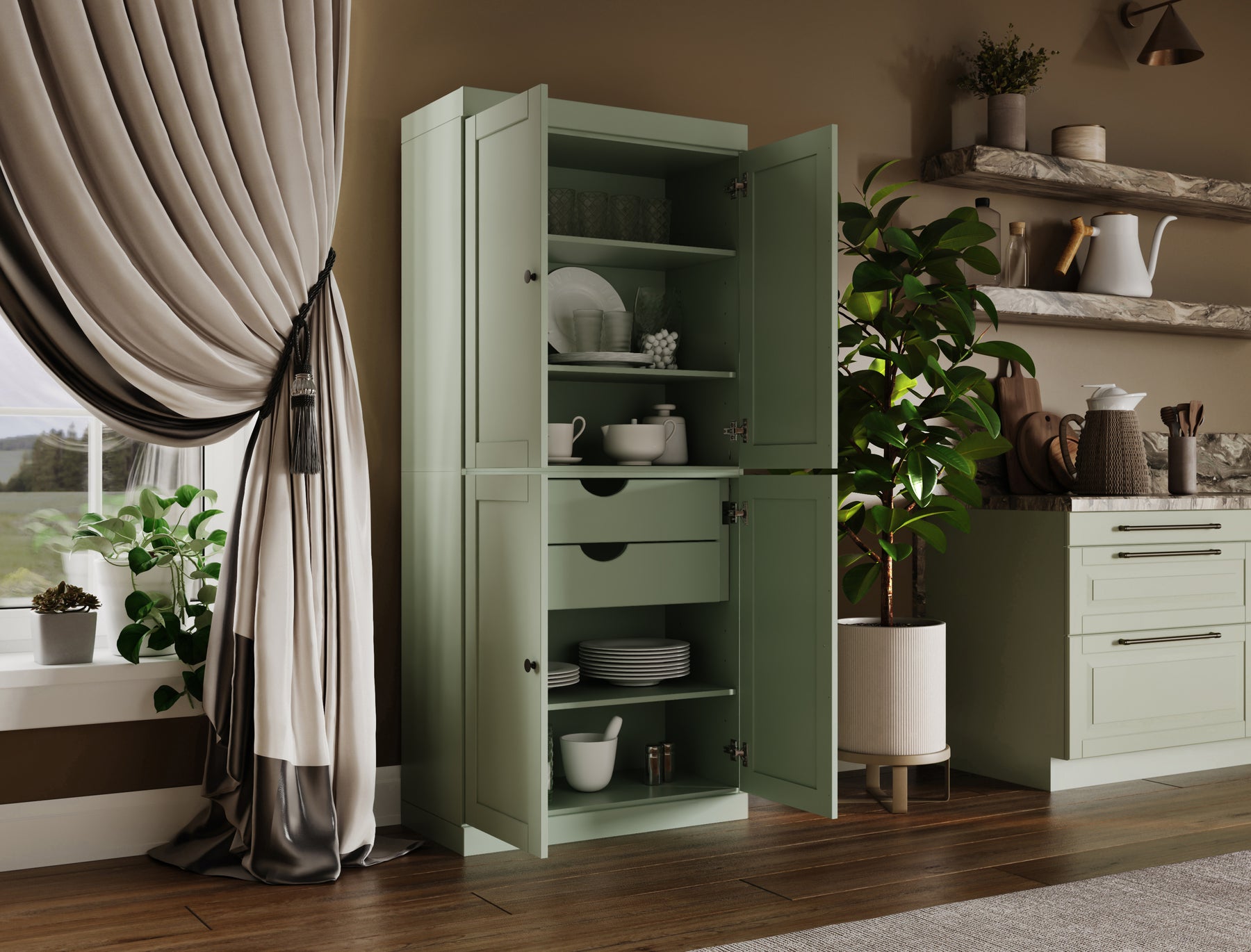 Transform your kitchen into an organized and stylish space with our 32"-wide pantry, handcrafted in Brazil from 100% solid wood. The shaker-style doors provide a clean, polished look while offering concealed storage for everything from pantry essentials to kitchenware. Adjustable shelves make it easy to customize the storage to your needs. For extra convenience, a stackable 2-drawer organizer is included—perfect for keeping smaller items within reach. Want more storage? Additional drawer units are available for purchase separately. With its sturdy build, versatile design, and refined elegance, this pantry is the perfect blend of functionality and beauty for any kitchen.