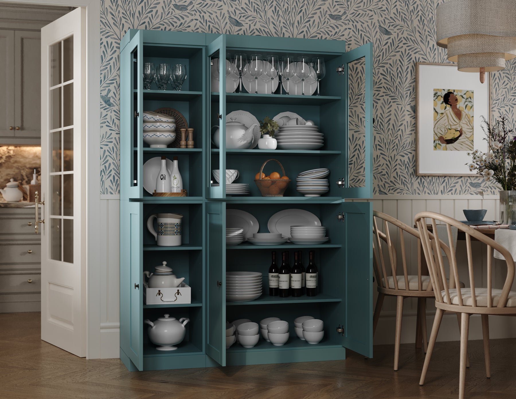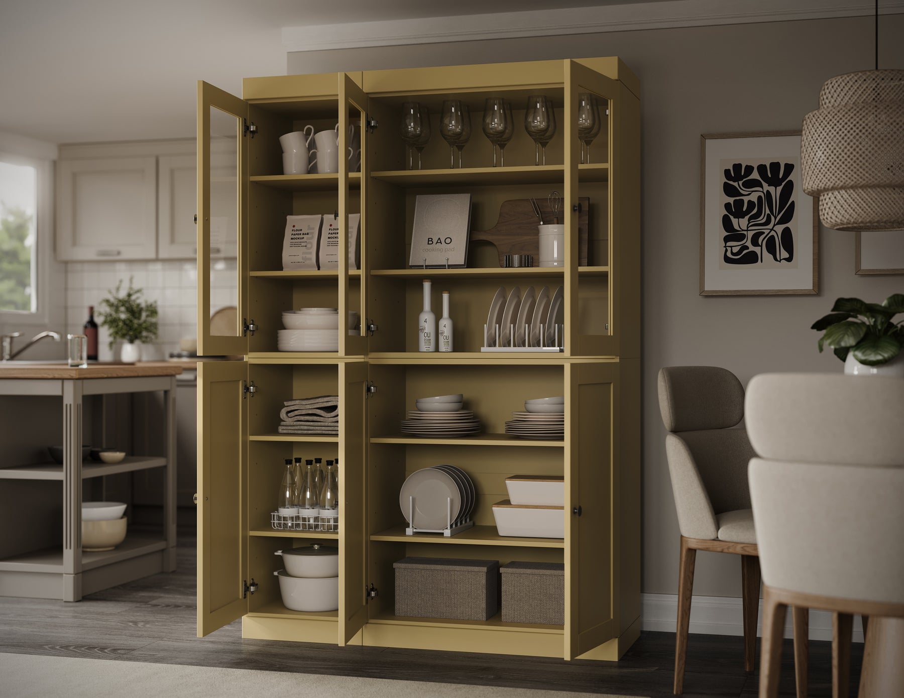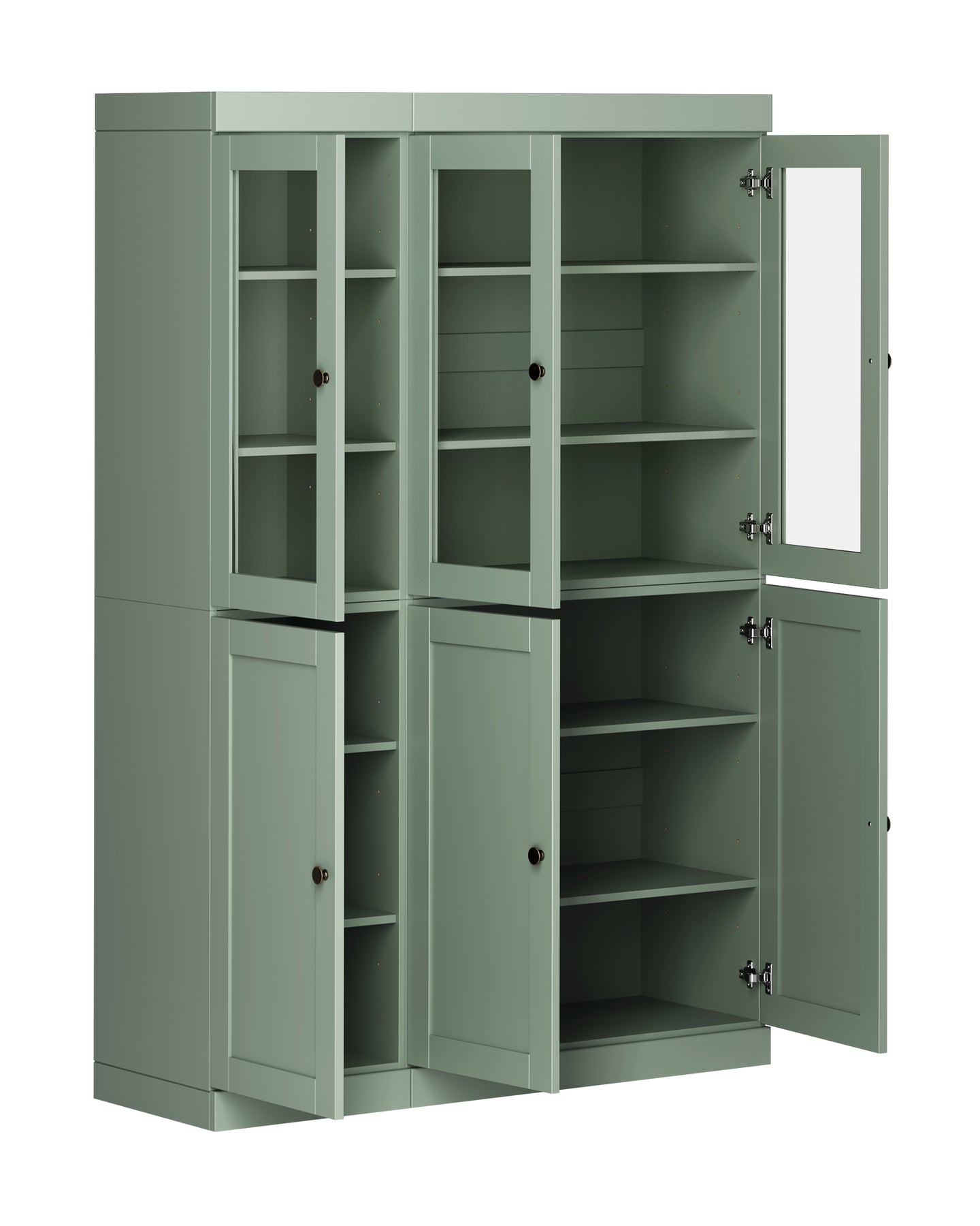This 100% solid wood 48.5"‐wide pantry is a perfect solution to your kitchen storage needs! Within easy reach and with 4 large and 4 small adjustable shelves it will allow you to store multiple items regardless of their size. Clear glass doors will showcase your wares while the solid wood shaker doors will make your pantry look stately no matter an occasional clutter. A 2-drawer organizer can be added and is perfect for the smaller loose items. More than one kit can be installed in the same unit. Get this Made in Brazil pantry today to make your kitchen sparkle!