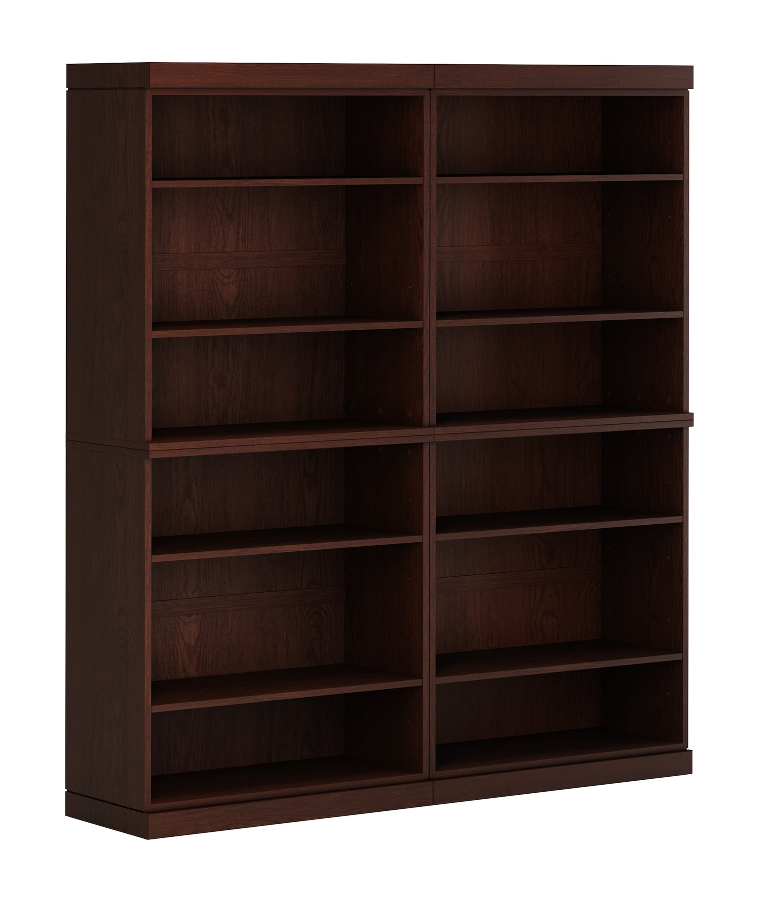 This 64-inch wide, 71.5-inch tall 12-shelf modular bookcase is formed by placing two matching 100% solid European oak bookcases side by side, creating a wide, balanced solid wood bookshelf for full-height storage and display. Handcrafted from sustainably sourced European oak hardwood, it provides twelve sturdy shelves for books, decor, and everyday essentials in living rooms, offices, or open living spaces.