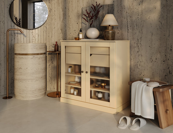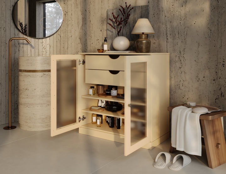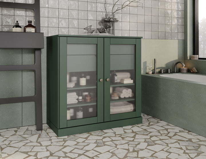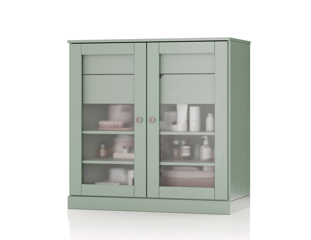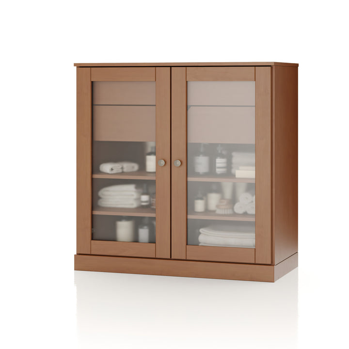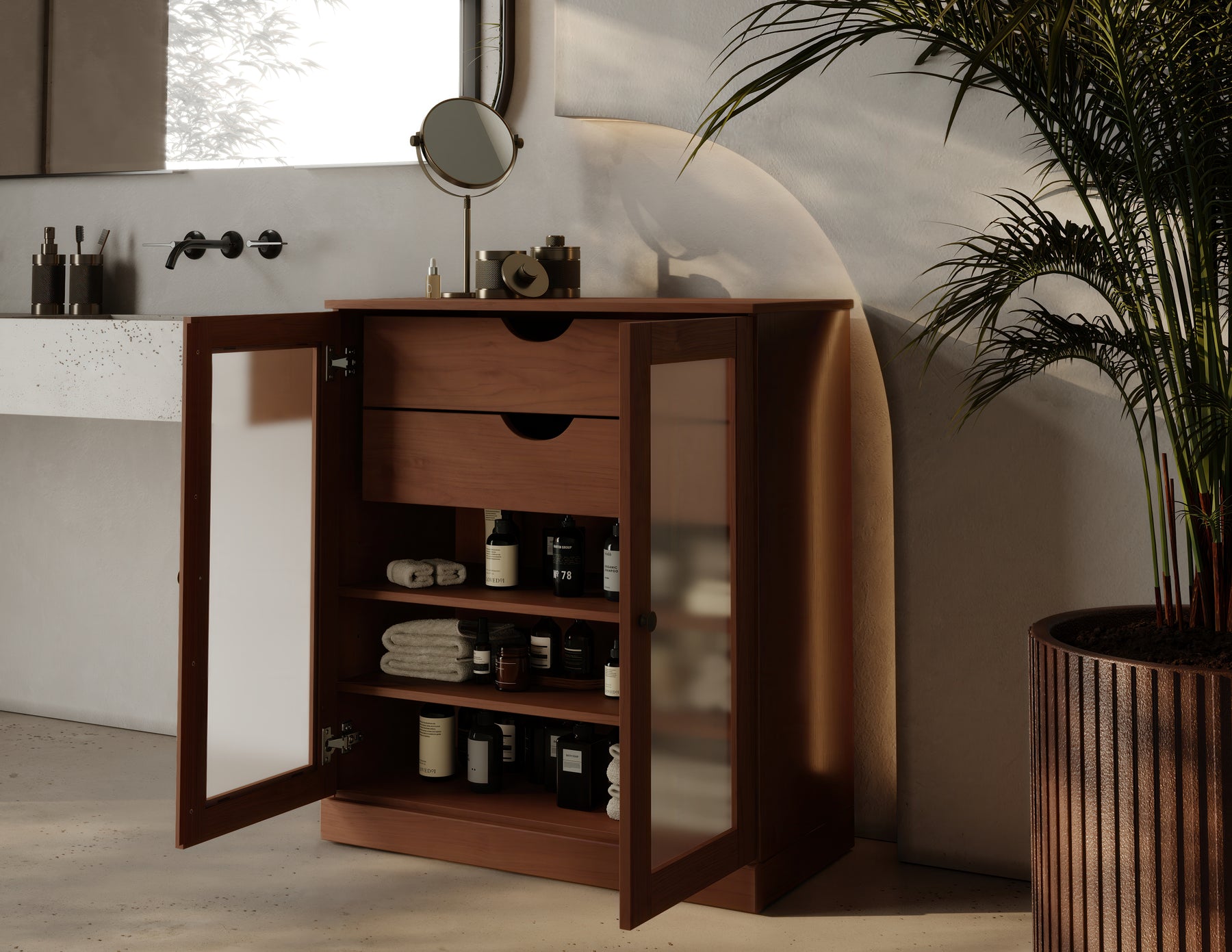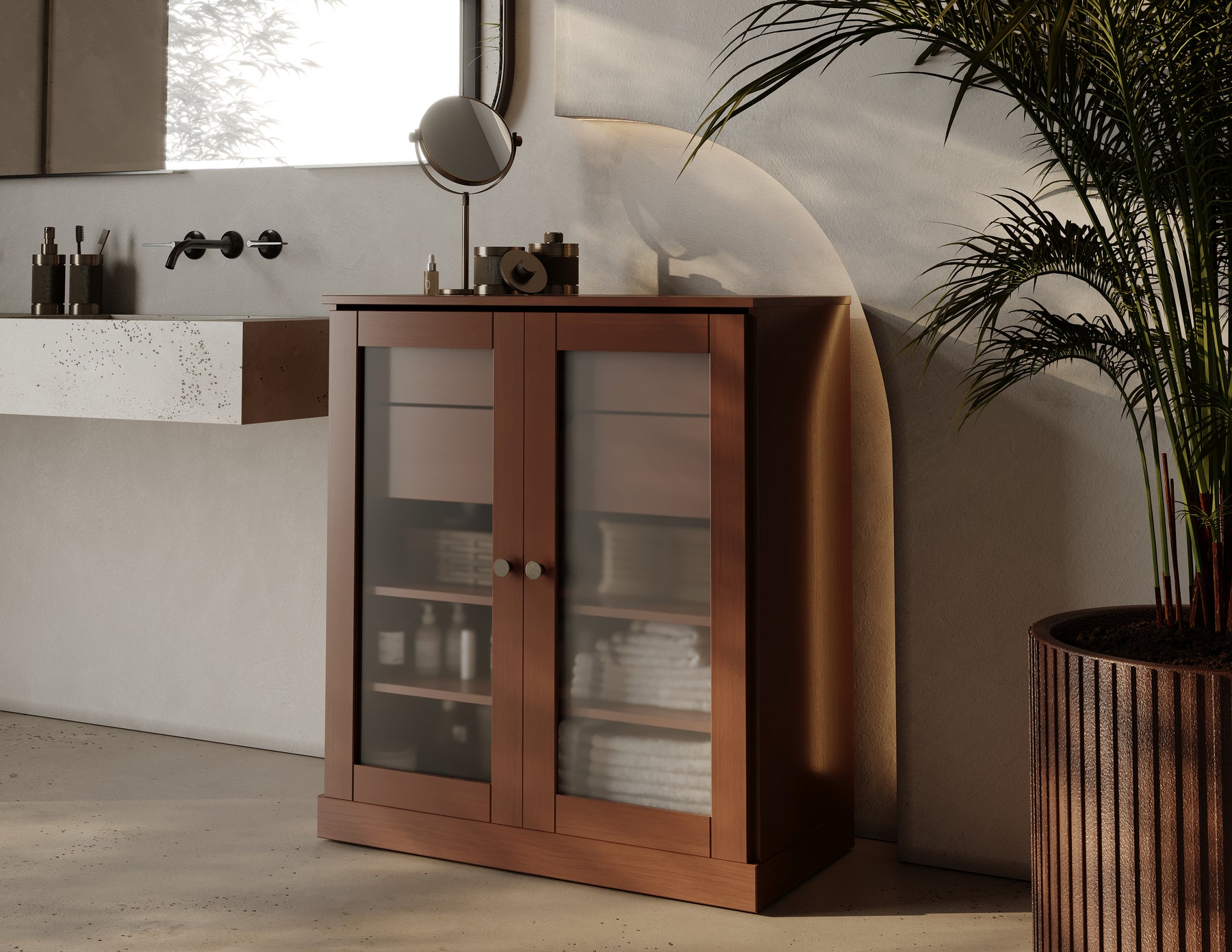 Enhance your bathroom with our 32" wide cabinet, expertly crafted from 100% solid wood in Brazil. This versatile cabinet offers adjustable shelves, providing ample space for items of varying sizes while allowing you to personalize your storage. The frosted glass doors lend a sophisticated touch, making this cabinet ideal for use in the bathroom, as a bookcase, storage cabinet, display unit, or even a shoe rack. For a more personalized look, interchangeable doors are available separately in frosted glass, clear glass, or solid wood—perfect for keeping your belongings discreetly tucked away. With its perfect balance of elegance and durability, this cabinet is designed to elevate both the style and functionality of your space.