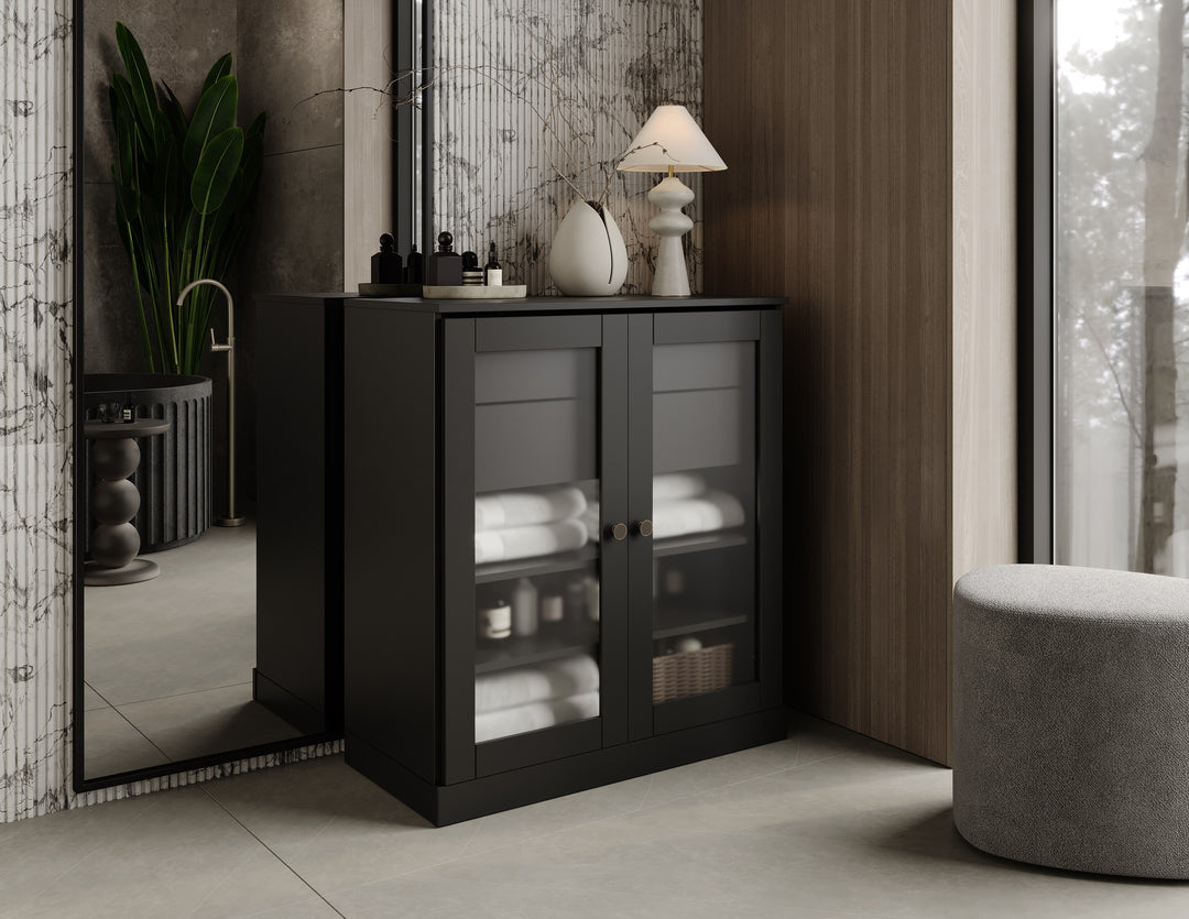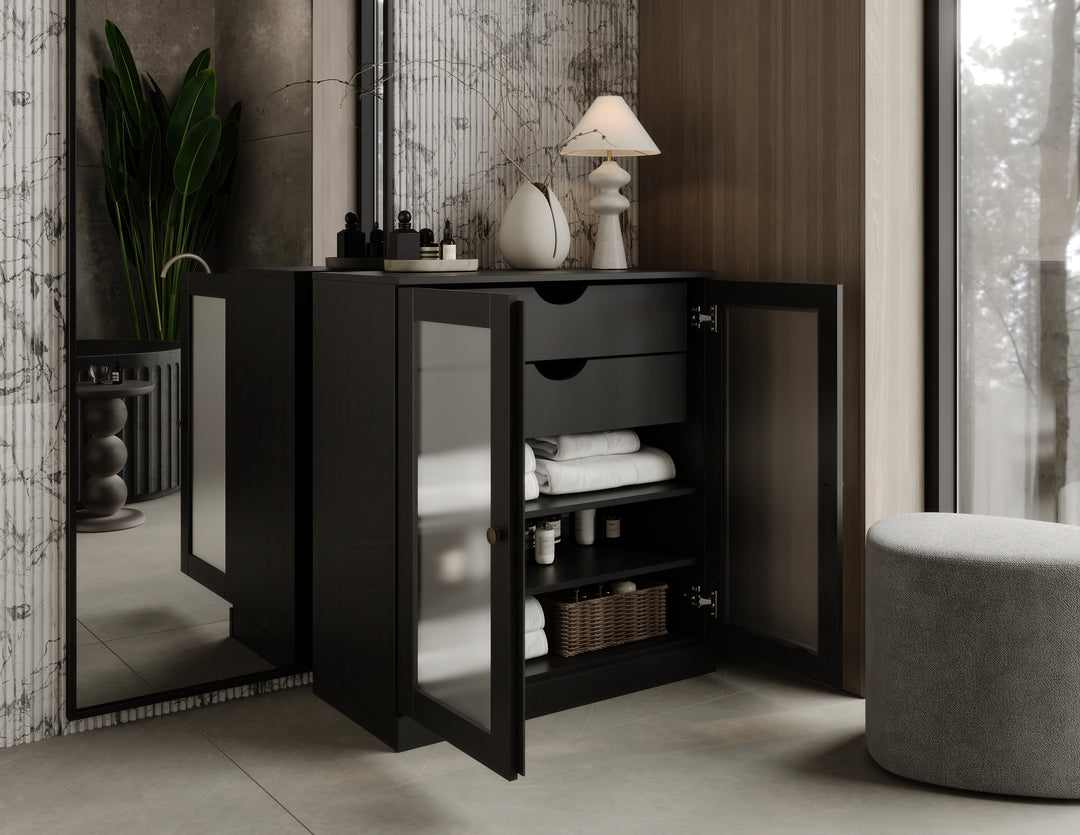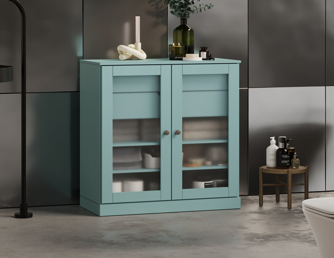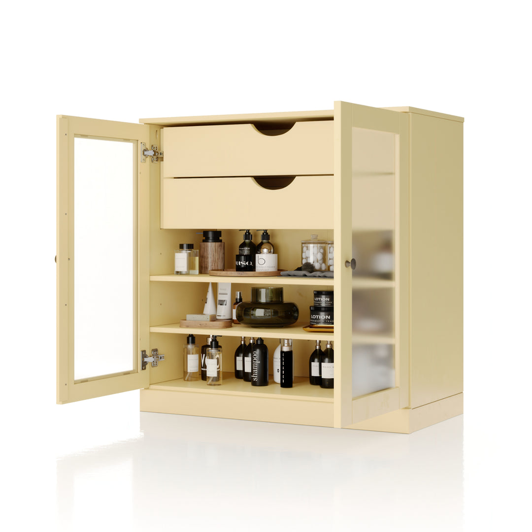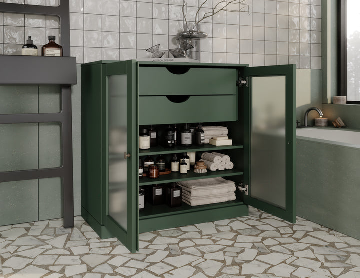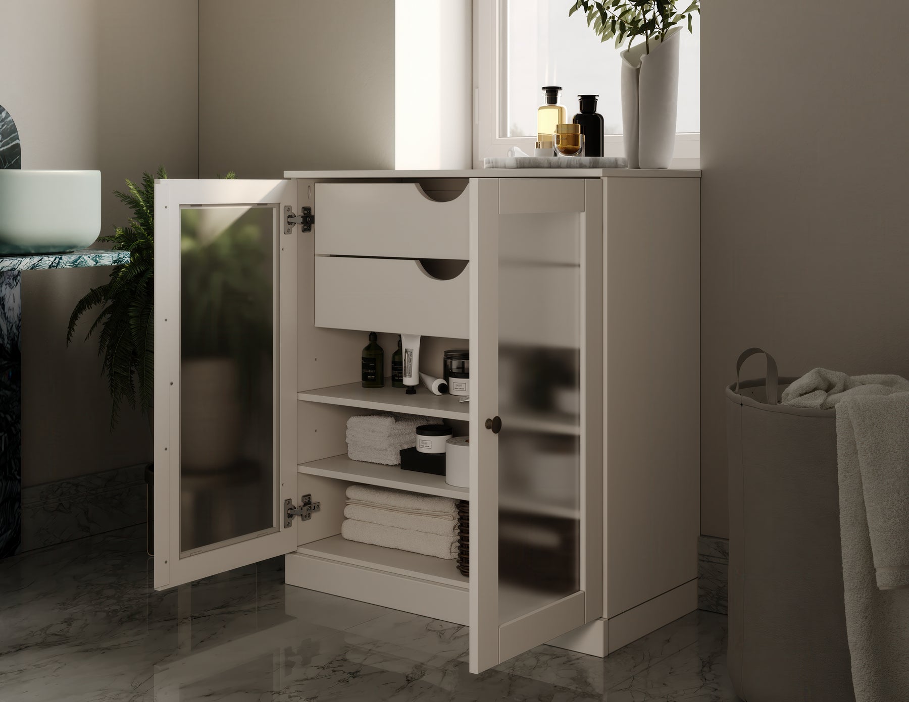 Enhance your bathroom with our 32" wide cabinet, expertly crafted from 100% solid wood in Brazil. This versatile cabinet offers adjustable shelves, providing ample space for items of varying sizes while allowing you to personalize your storage. The frosted glass doors lend a sophisticated touch, making this cabinet ideal for use in the bathroom, as a bookcase, storage cabinet, display unit, or even a shoe rack. For a more personalized look, interchangeable doors are available separately in frosted glass, clear glass, or solid wood—perfect for keeping your belongings discreetly tucked away. With its perfect balance of elegance and durability, this cabinet is designed to elevate both the style and functionality of your space.