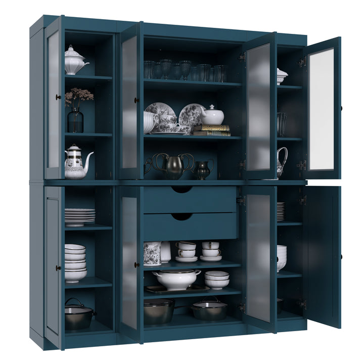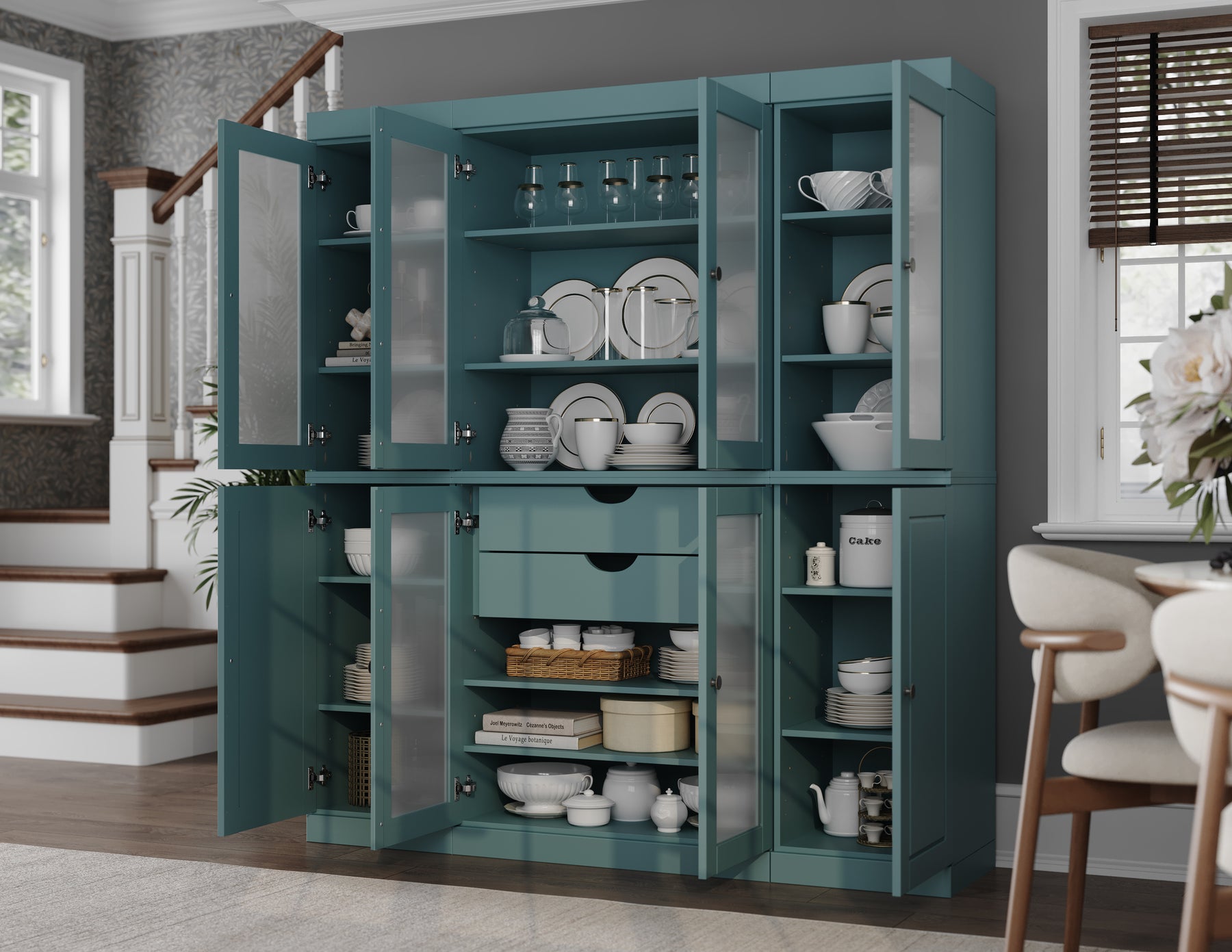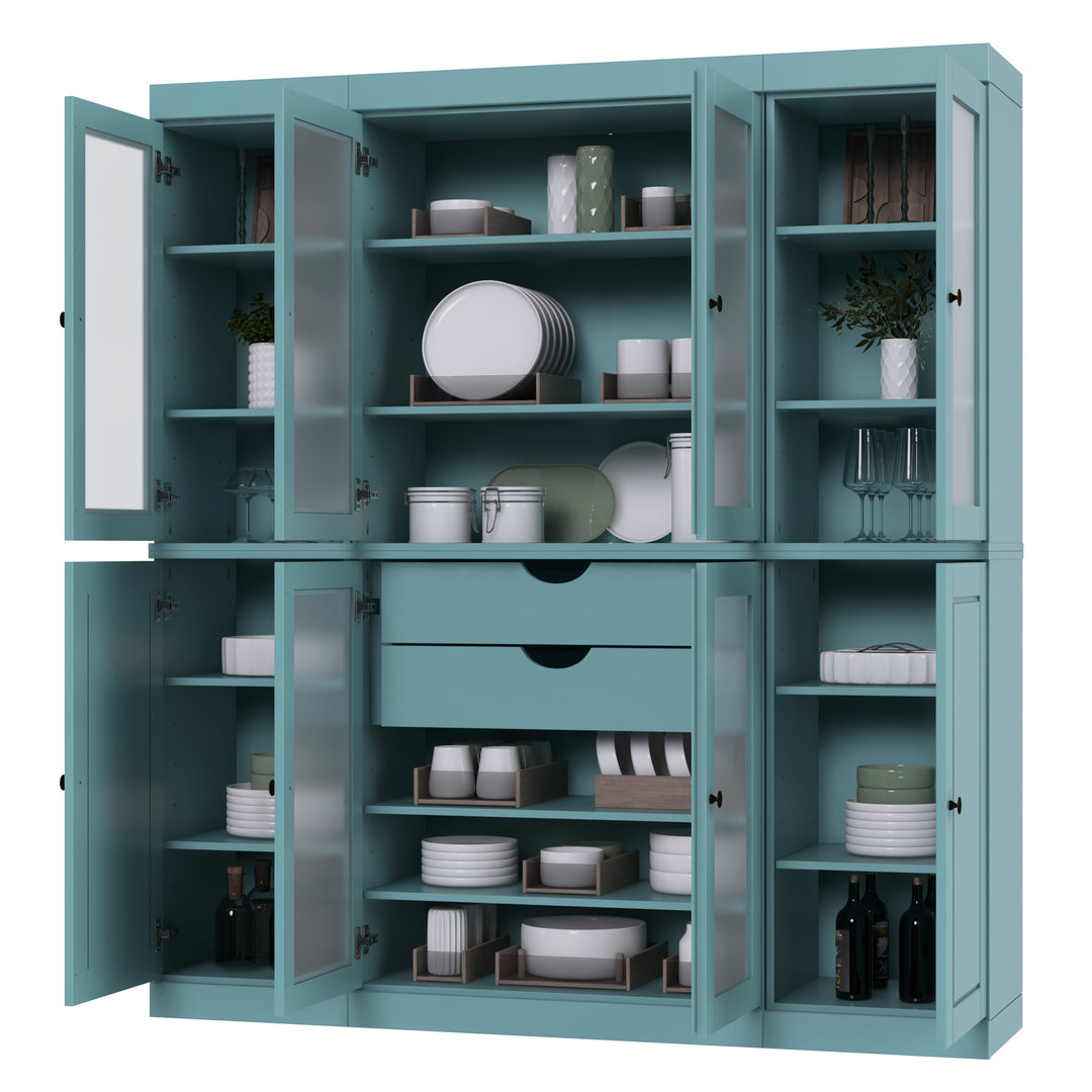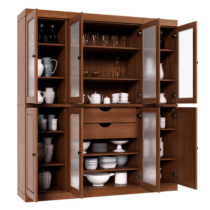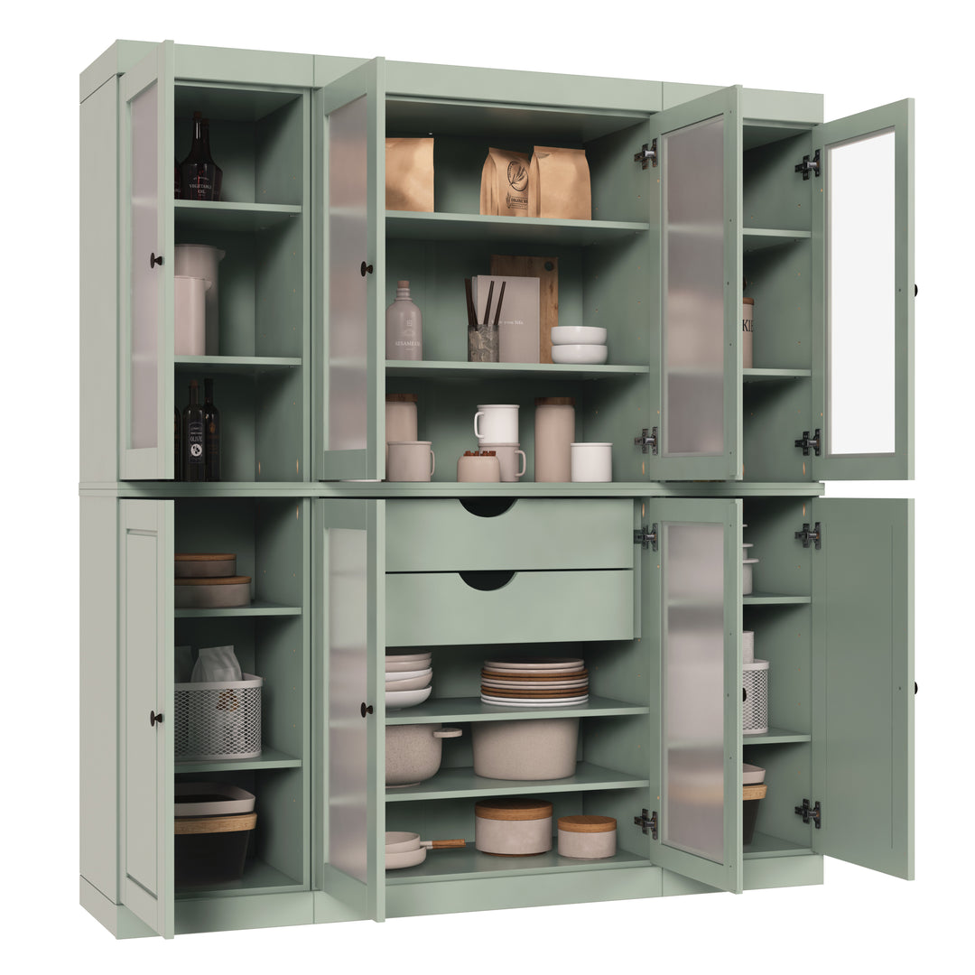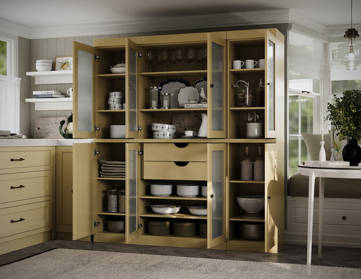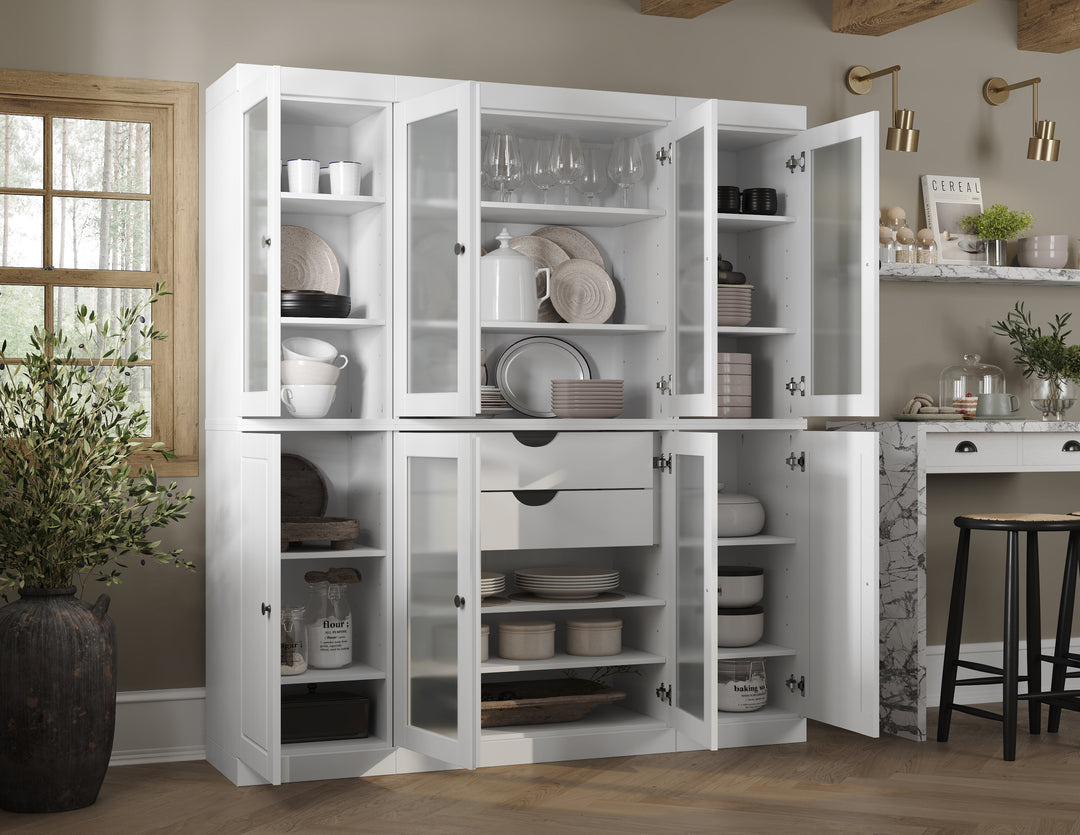 This 100% solid wood 65"‐wide pantry is a perfect solution to your kitchen storage needs! Within easy reach and with 4 large and 8 small adjustable shelves it will allow you to store multiple items regardless of their size. Frosted glass doors will showcase your wares while the raised panel solid wood doors will make your pantry look stately no matter an occasional clutter. A 2-drawer organizer is included and is perfect for the smaller loose items. More than one kit can be installed in the same unit. Get this Made in Brazil pantry today to make your kitchen sparkle!