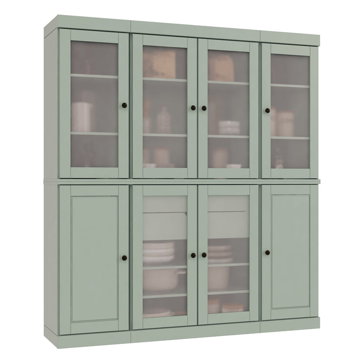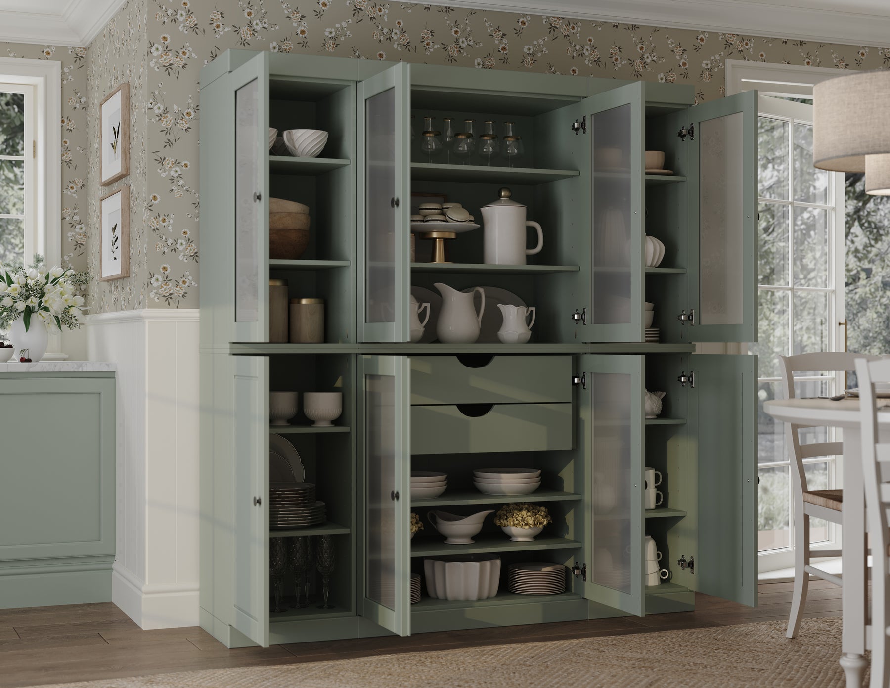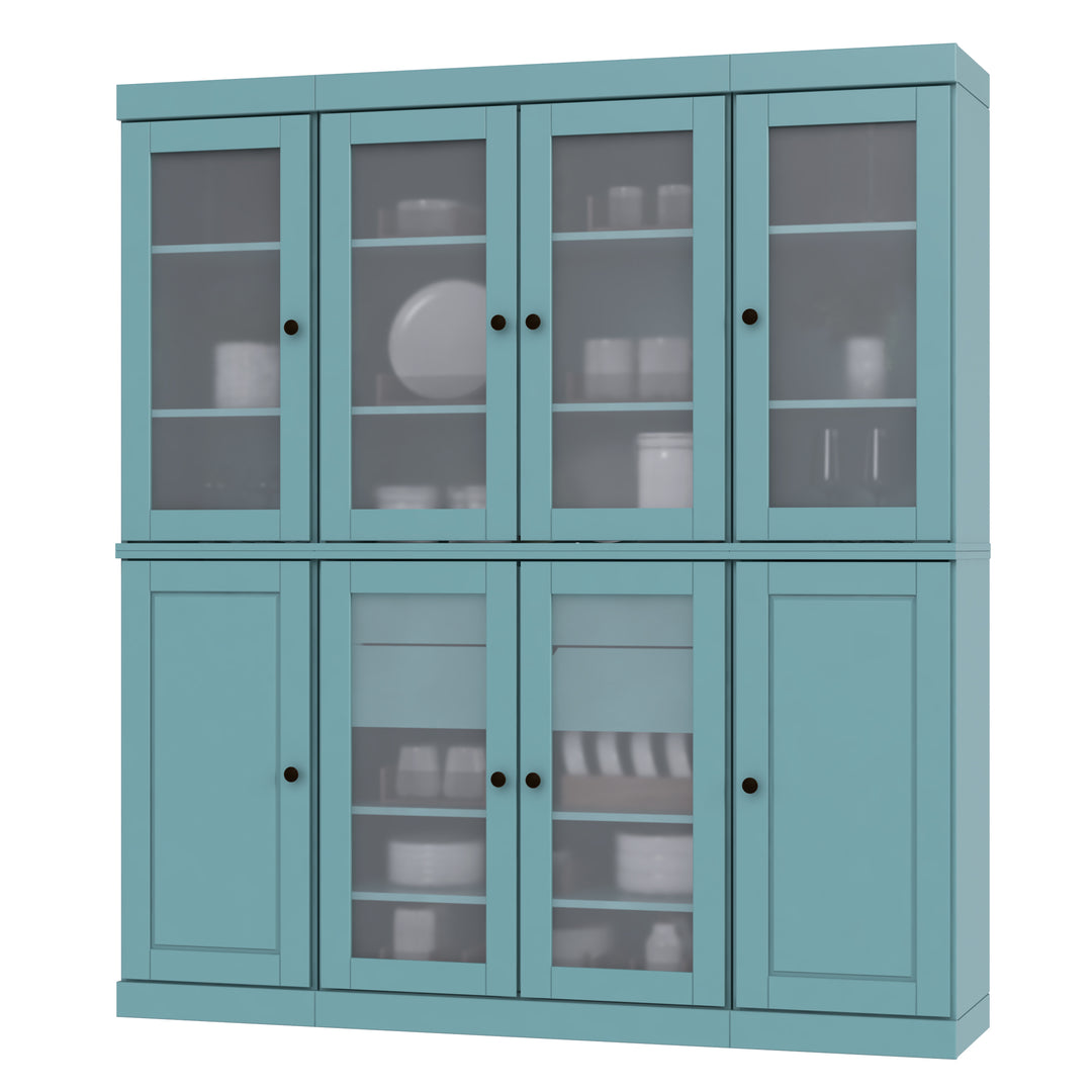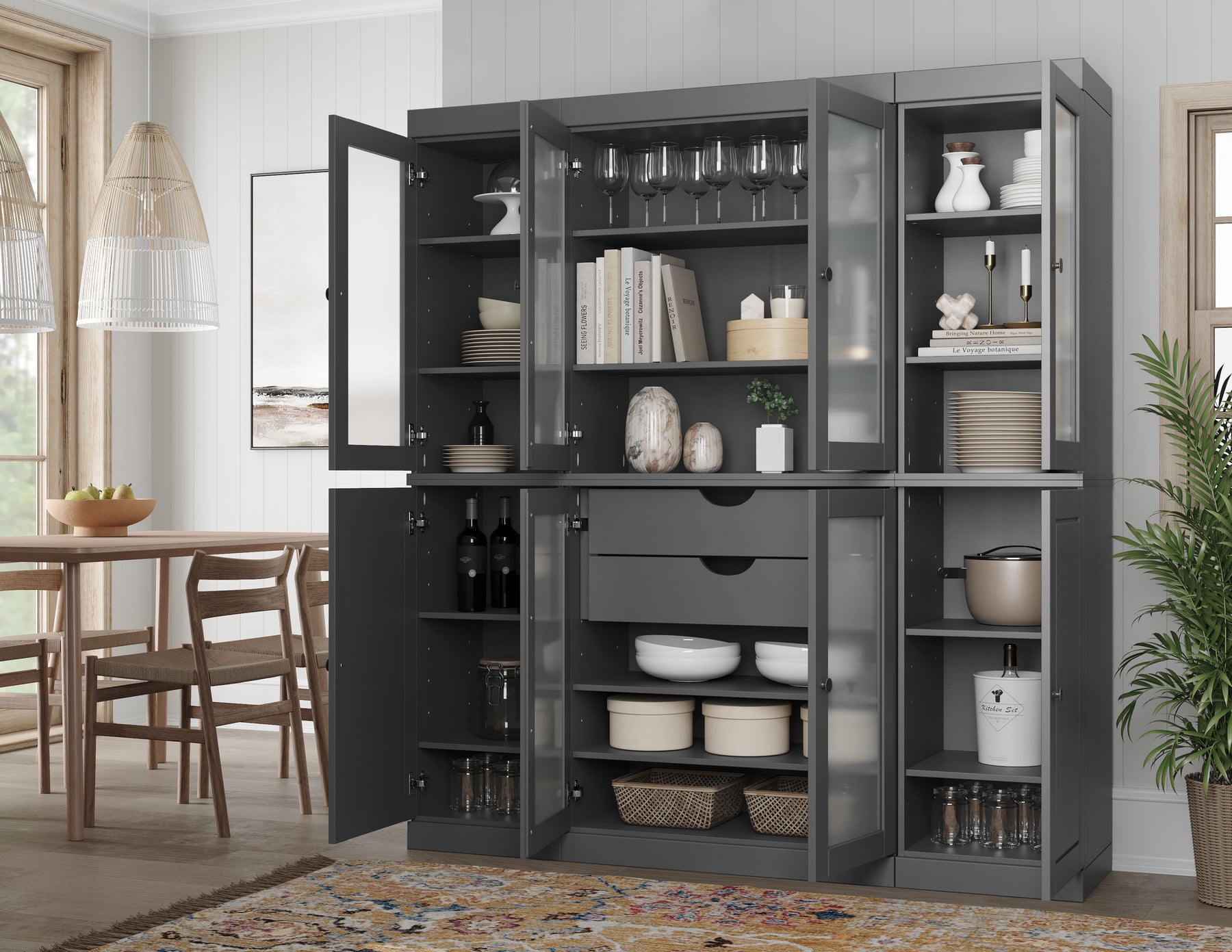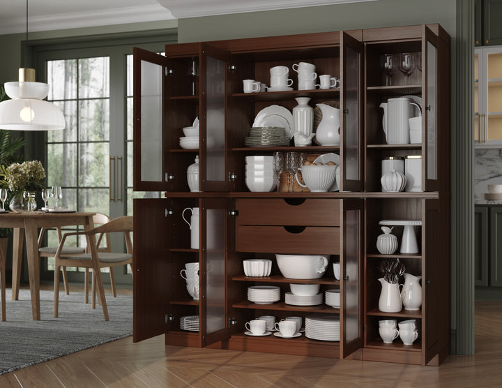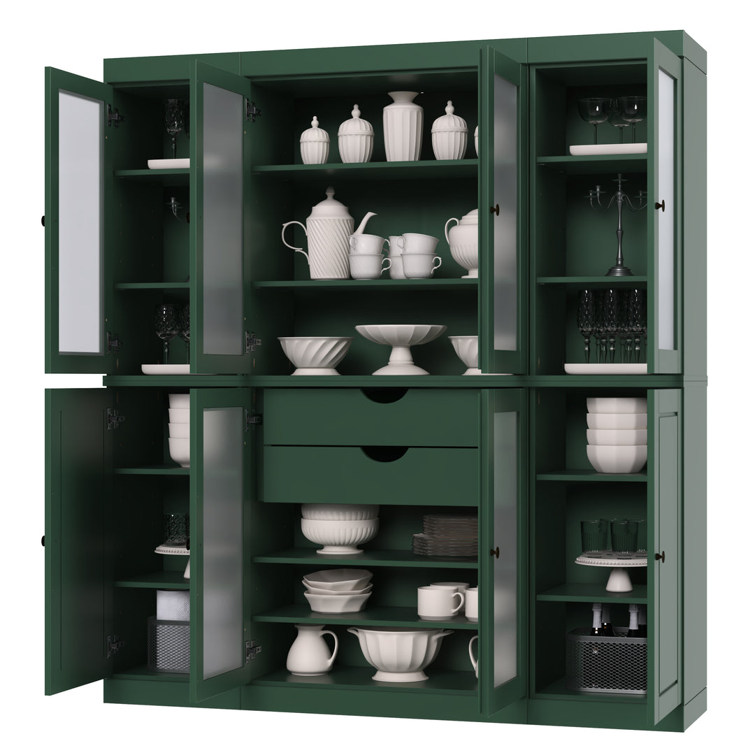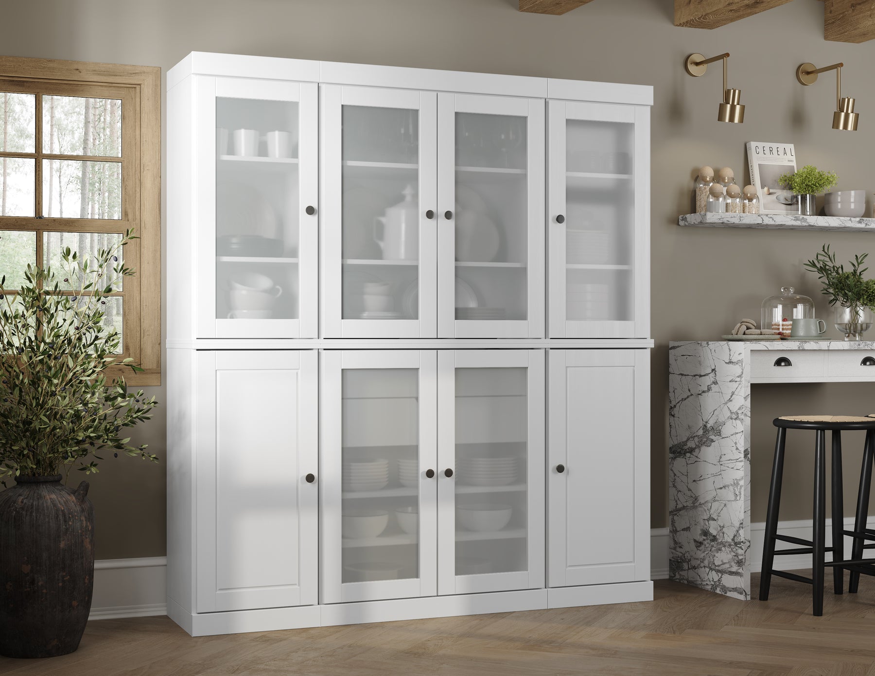 This 100% solid wood 65"‐wide pantry is a perfect solution to your kitchen storage needs! Within easy reach and with 4 large and 8 small adjustable shelves it will allow you to store multiple items regardless of their size. Frosted glass doors will showcase your wares while the raised panel solid wood doors will make your pantry look stately no matter an occasional clutter. A 2-drawer organizer is included and is perfect for the smaller loose items. More than one kit can be installed in the same unit. Get this Made in Brazil pantry today to make your kitchen sparkle!