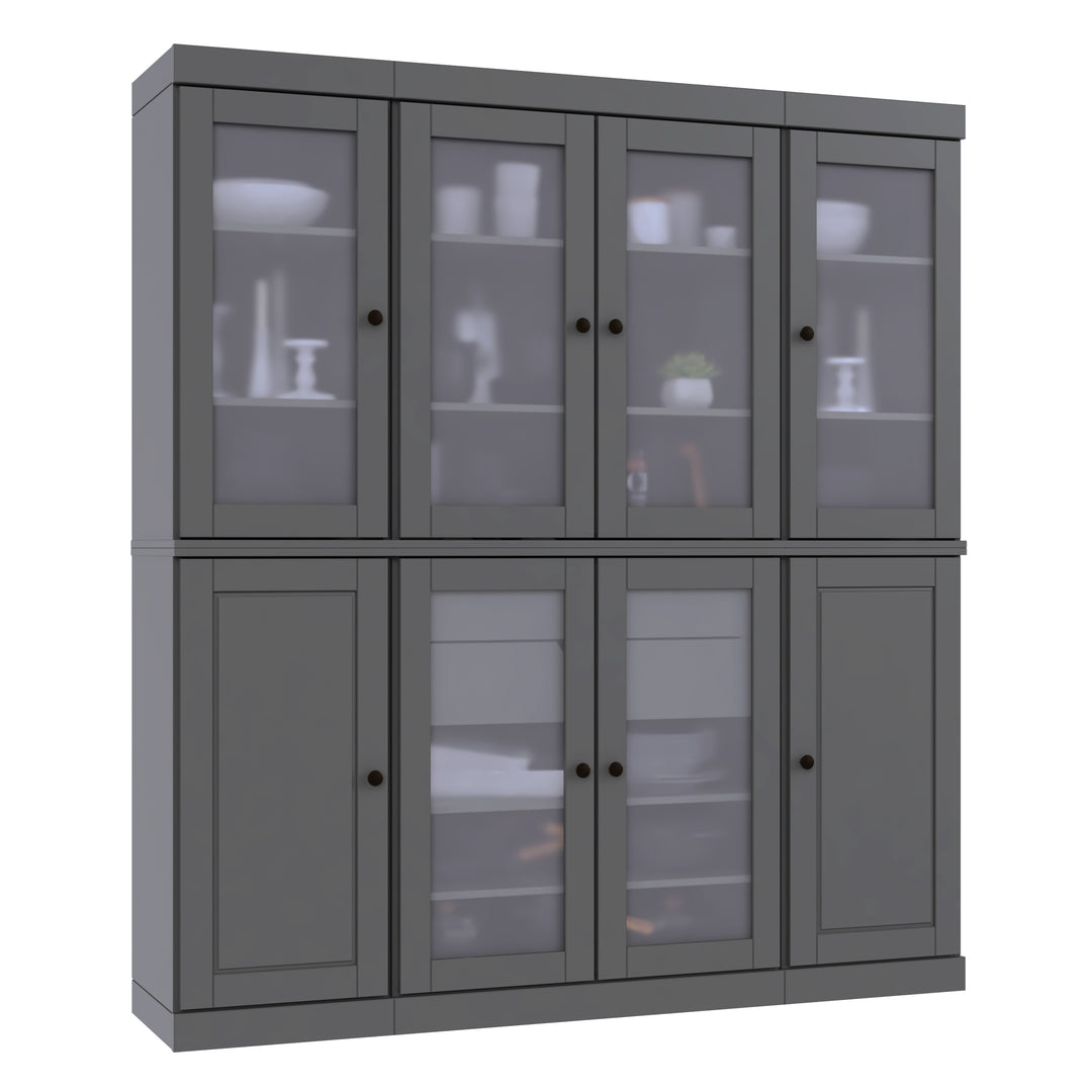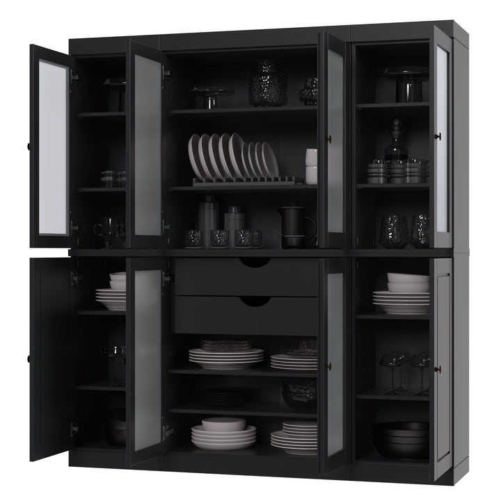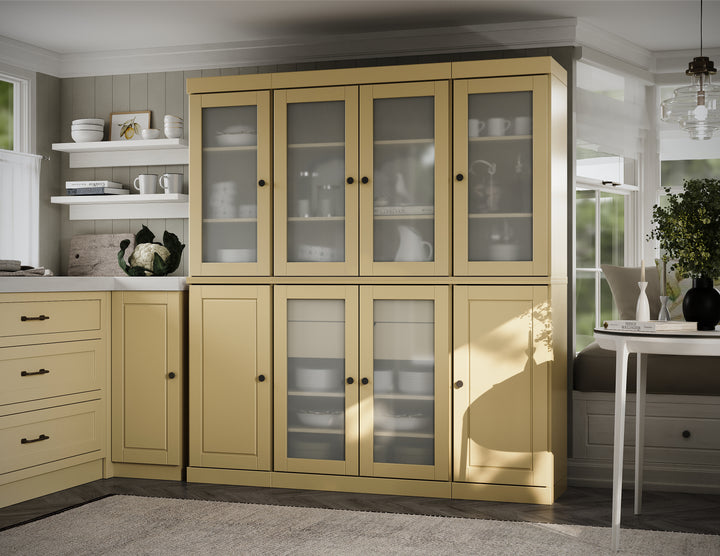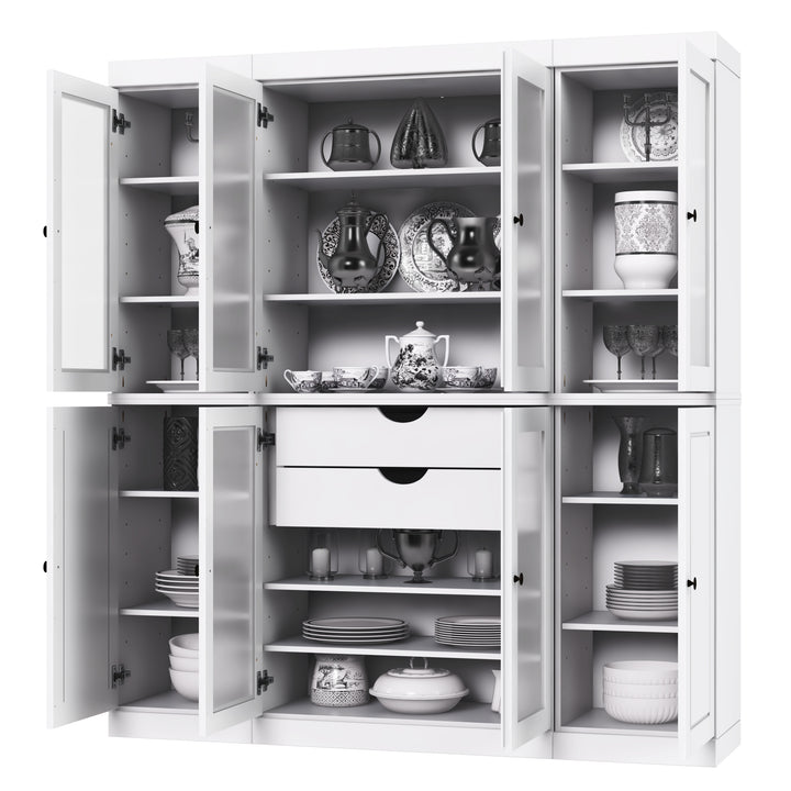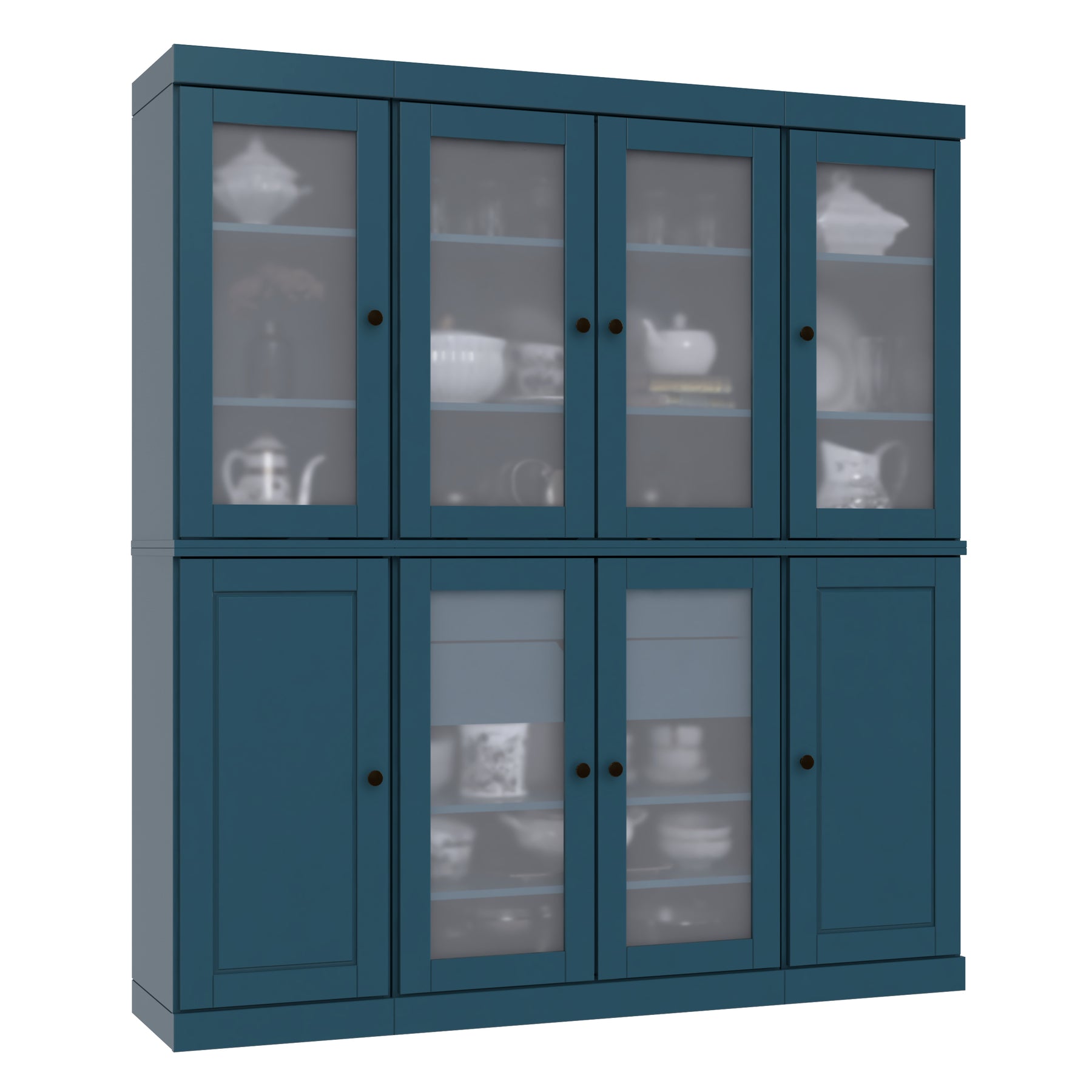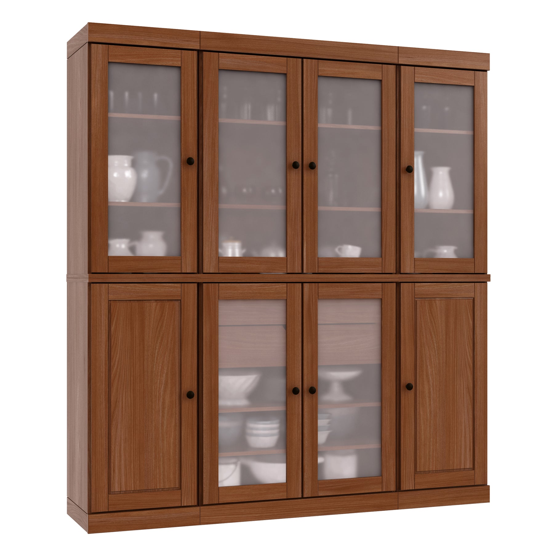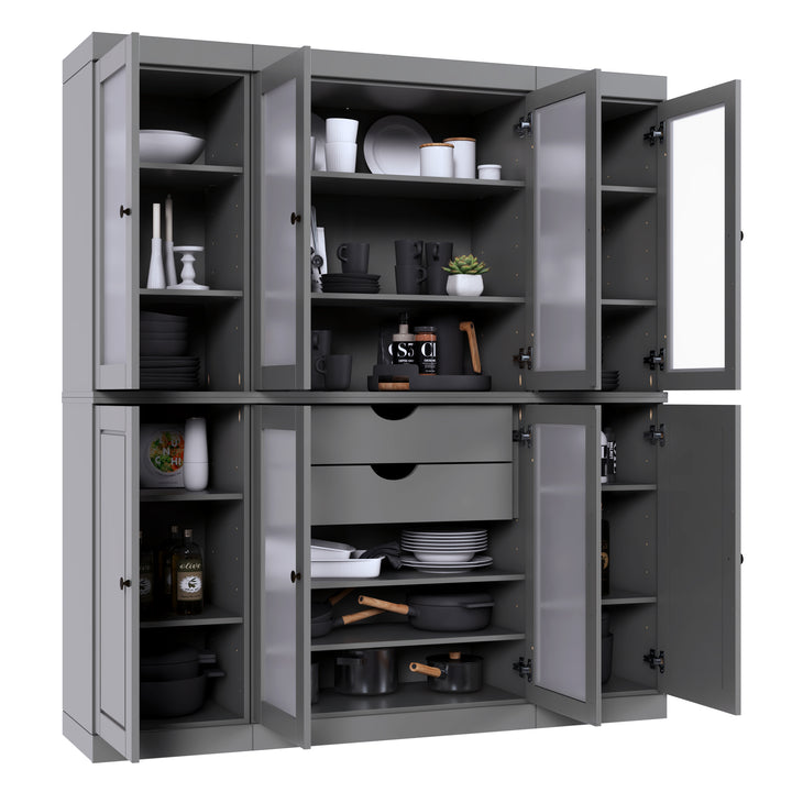 This 100% solid wood 65"‐wide pantry is a perfect solution to your kitchen storage needs! Within easy reach and with 4 large and 8 small adjustable shelves it will allow you to store multiple items regardless of their size. Frosted glass doors will showcase your wares while the raised panel solid wood doors will make your pantry look stately no matter an occasional clutter. A 2-drawer organizer is included and is perfect for the smaller loose items. More than one kit can be installed in the same unit. Get this Made in Brazil pantry today to make your kitchen sparkle!