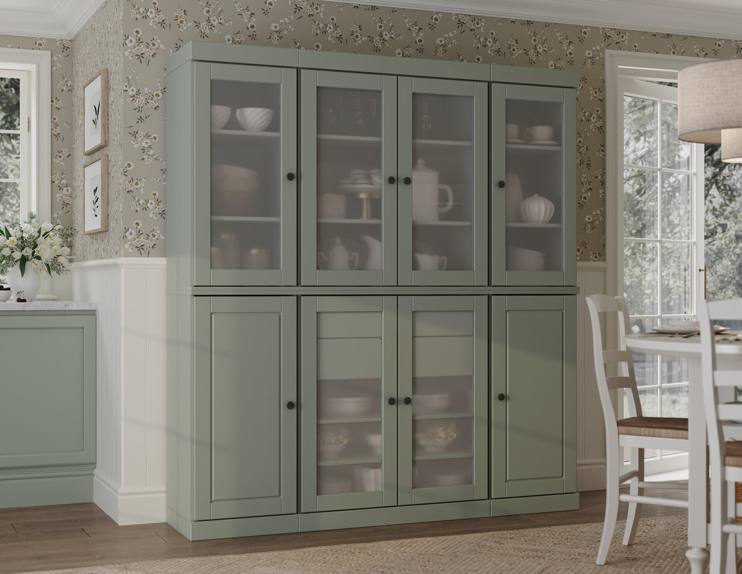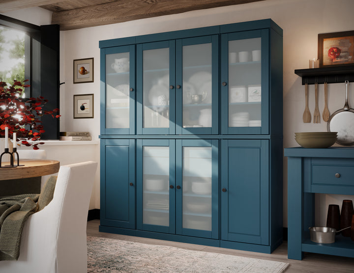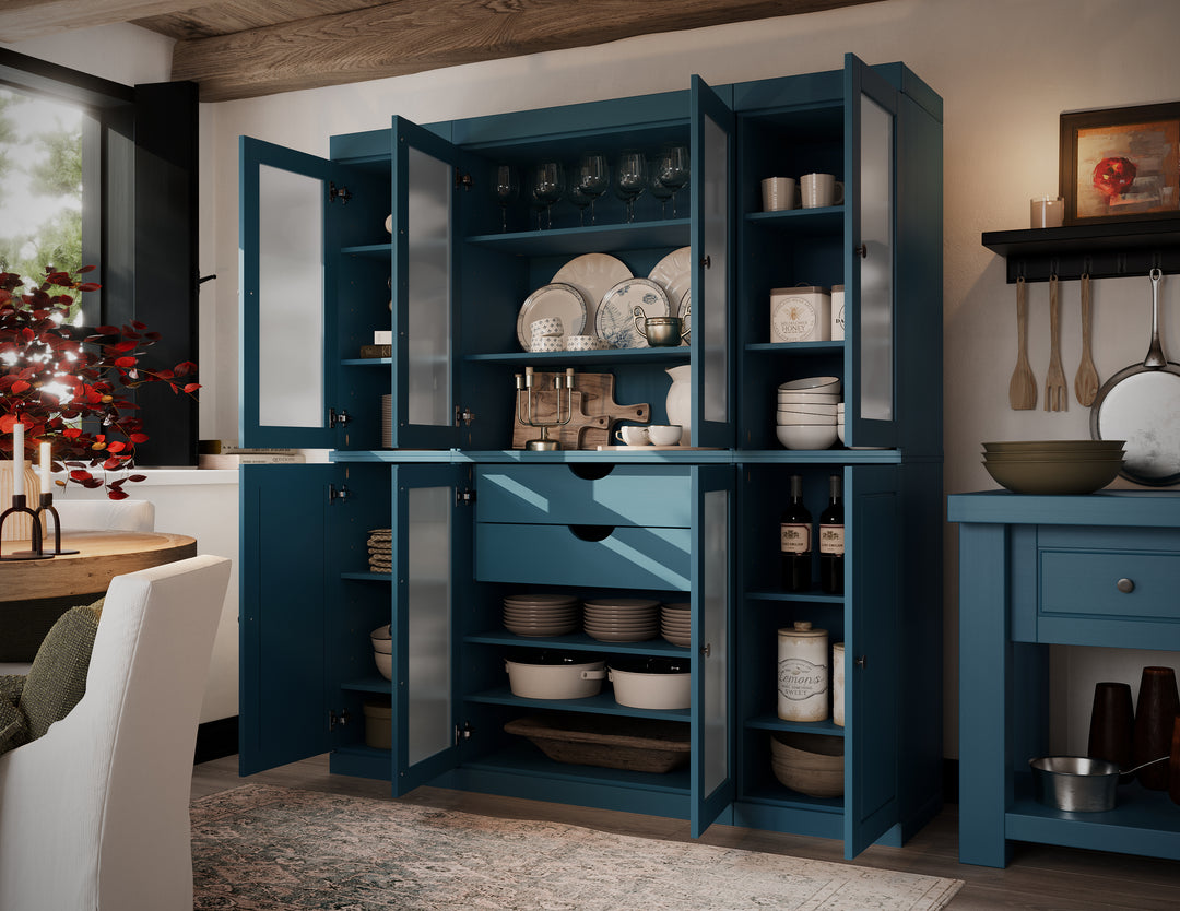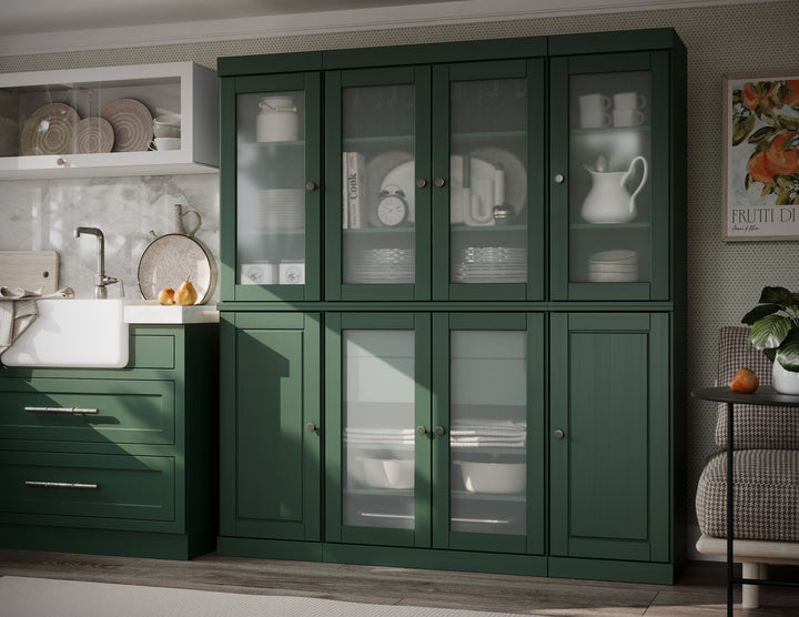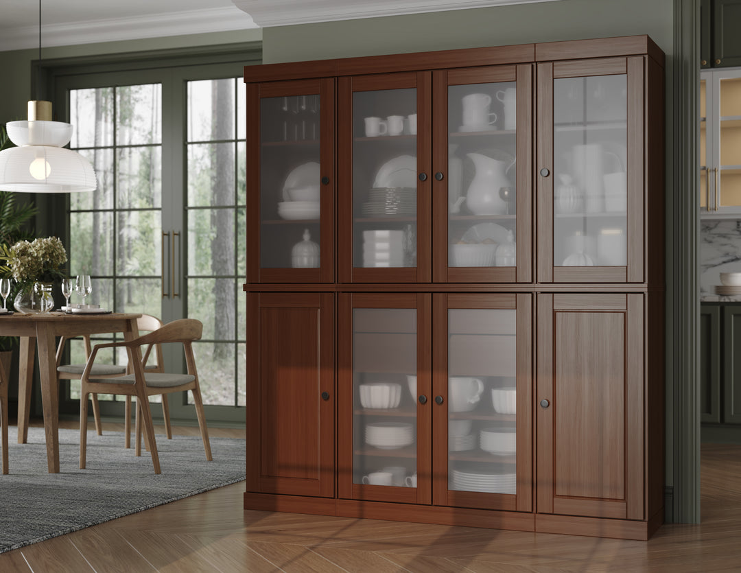 - Interchangeable frosted glass and raised panel doors on self-closing hinges