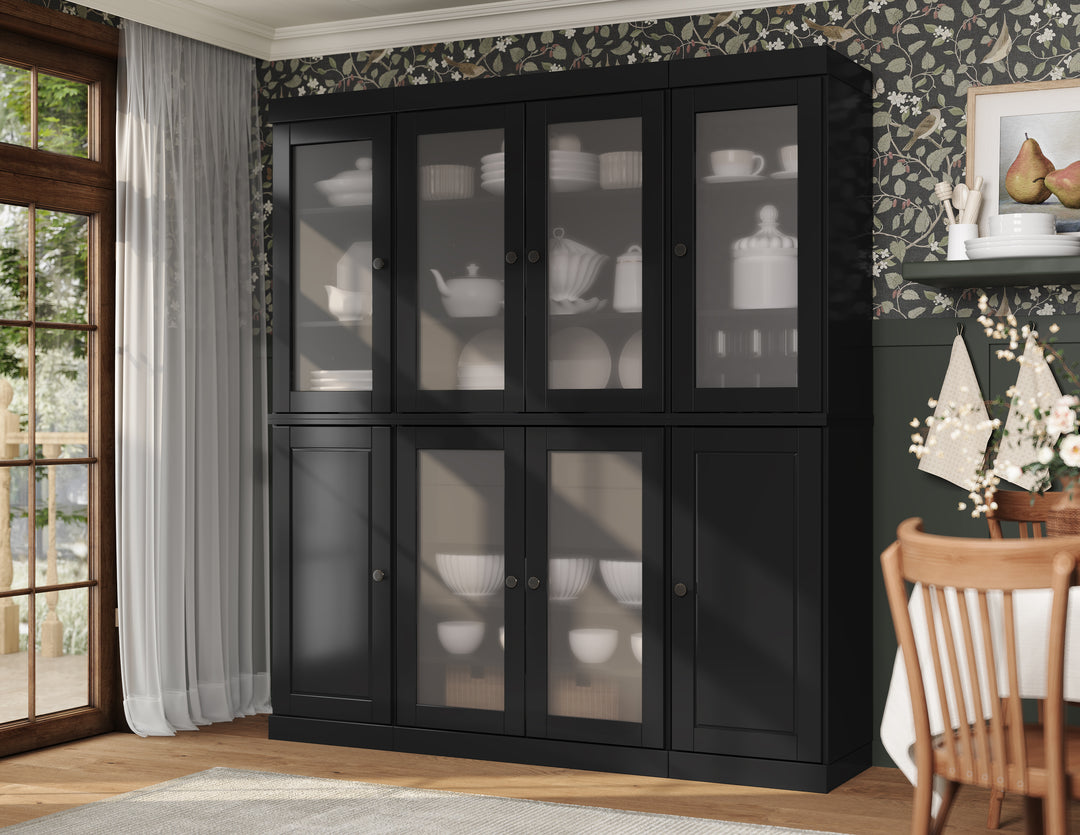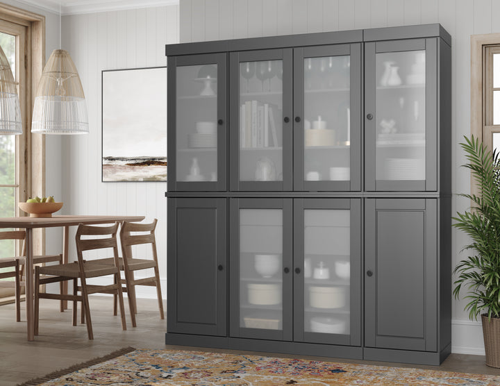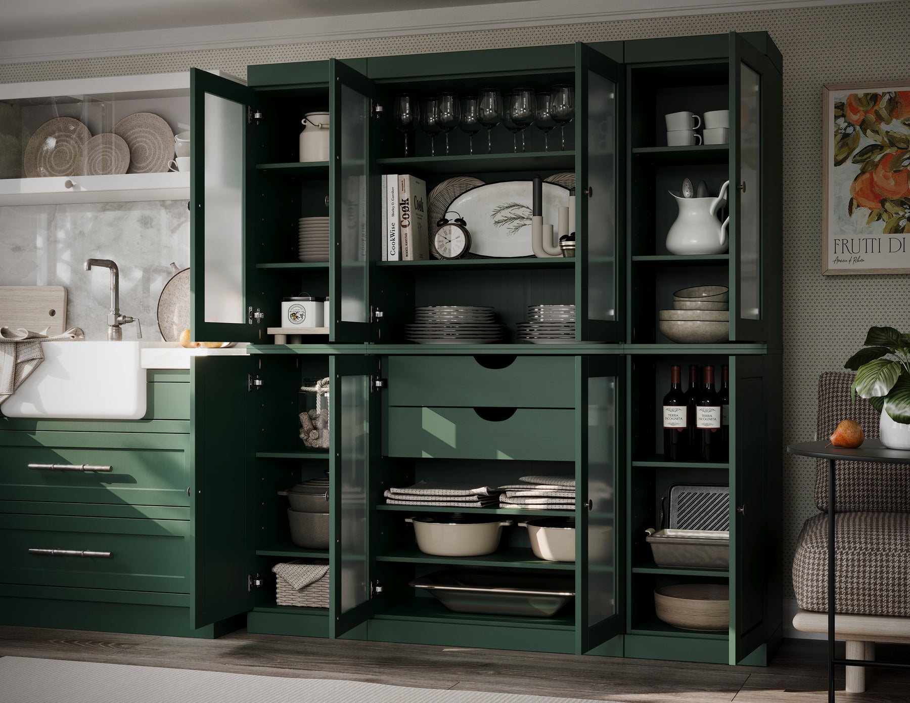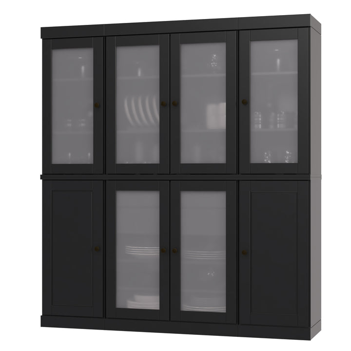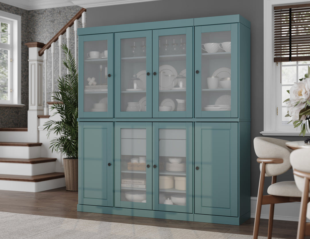 - Interchangeable frosted glass and raised panel doors on self-closing hinges
