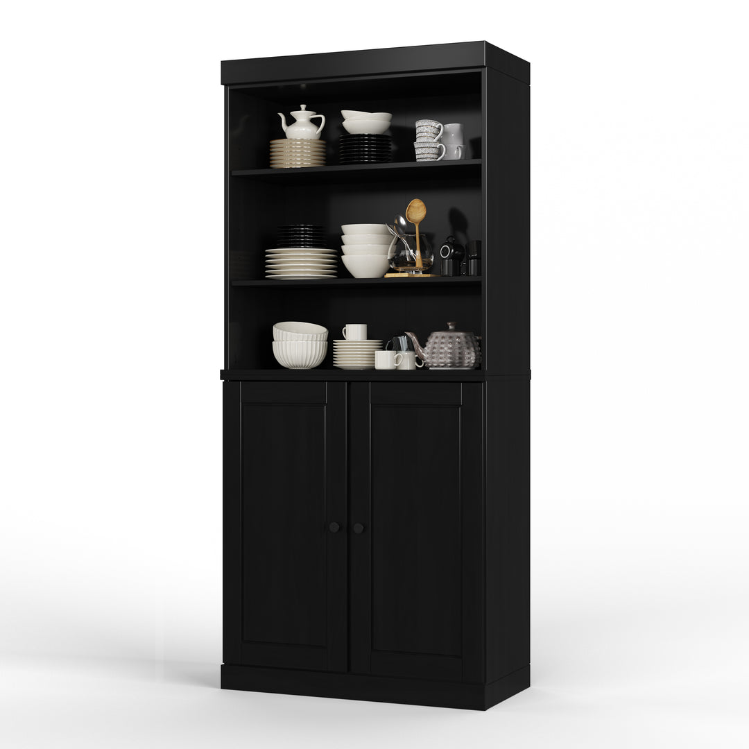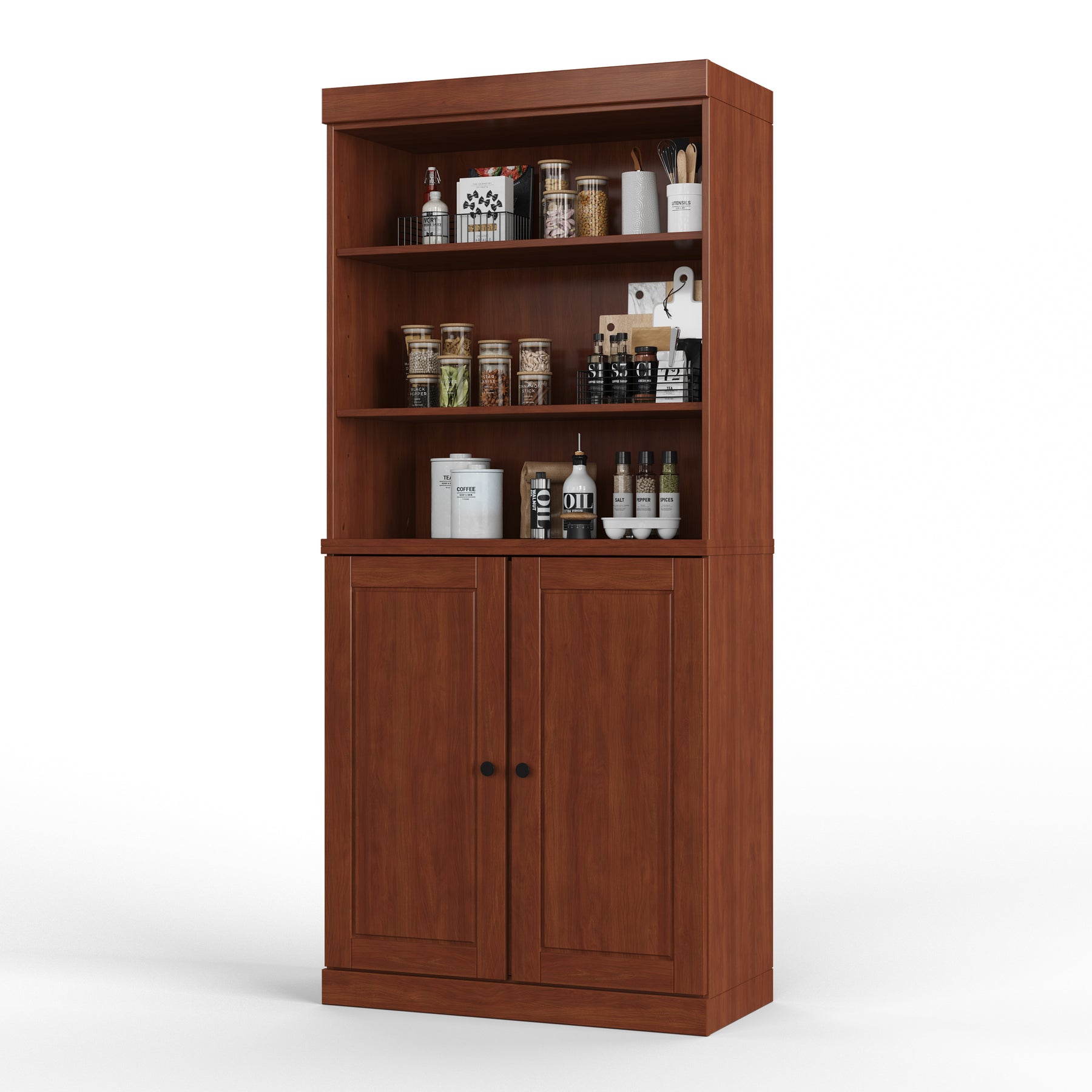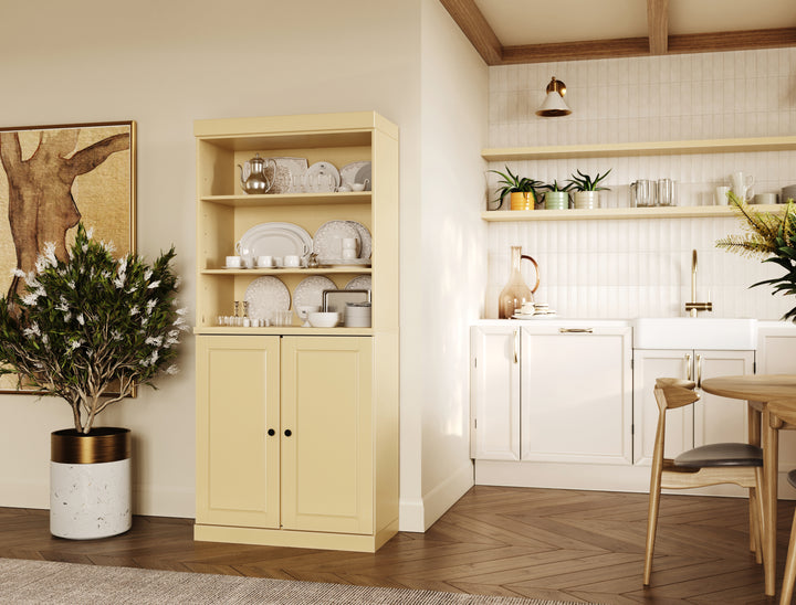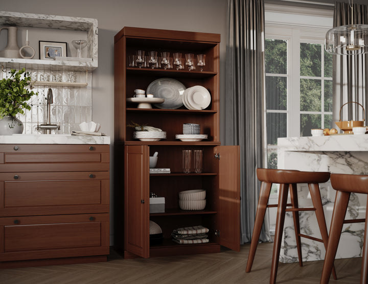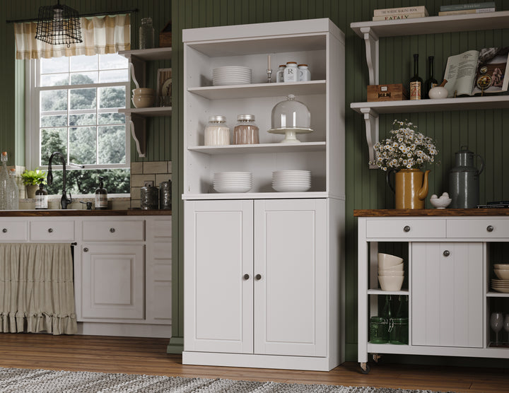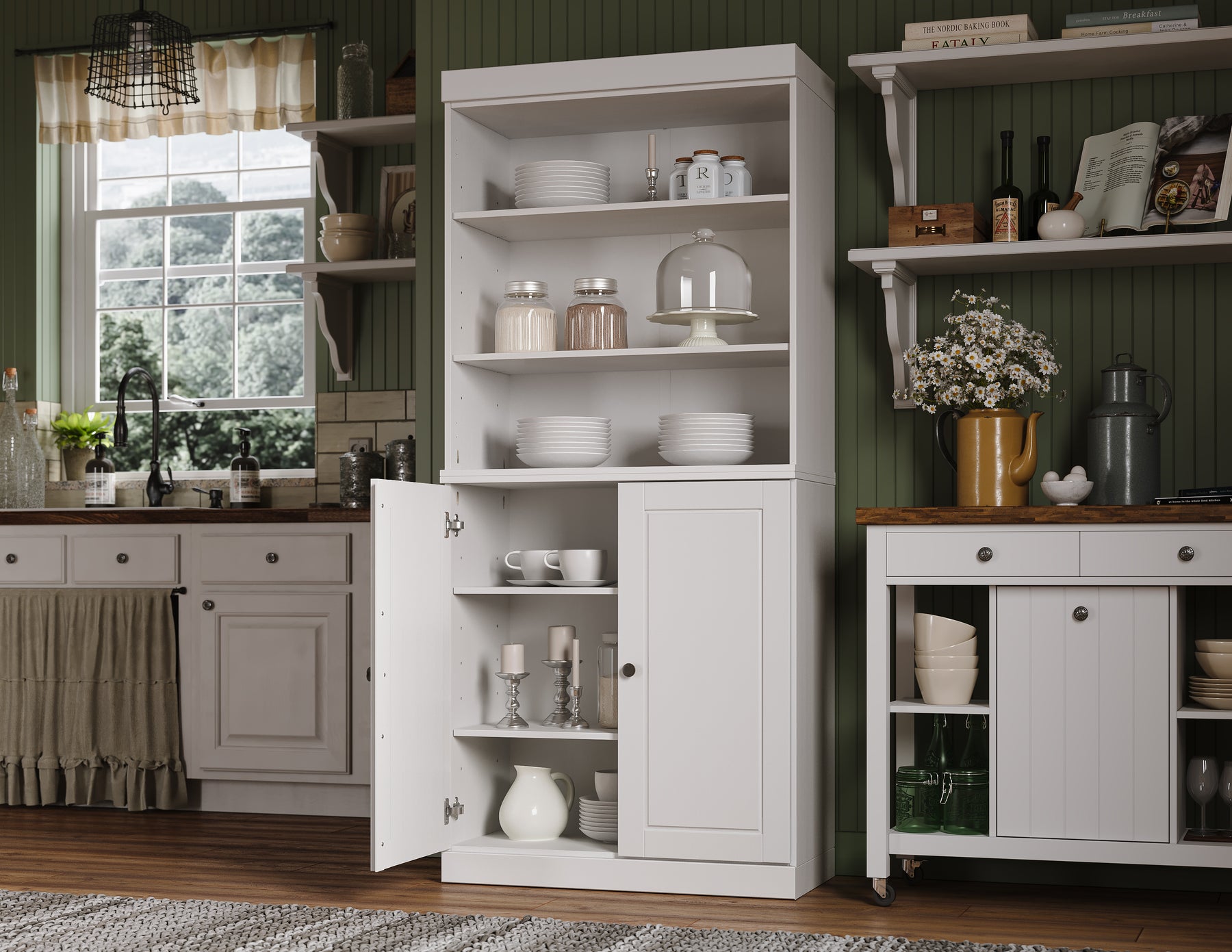 Crafted from premium solid wood, this pantry exudes natural beauty and sturdiness, bringing warmth and charm to your kitchen. Its thoughtful design includes four adjustable shelves, easily tailored to accommodate your storage needs, from pantry staples to taller kitchen essentials. Need even more space? Add extra shelves as your collection grows. Select from clear glass doors for an elegant showcase, frosted glass for subtle sophistication, or raised panel wood doors for a classic, concealed look.