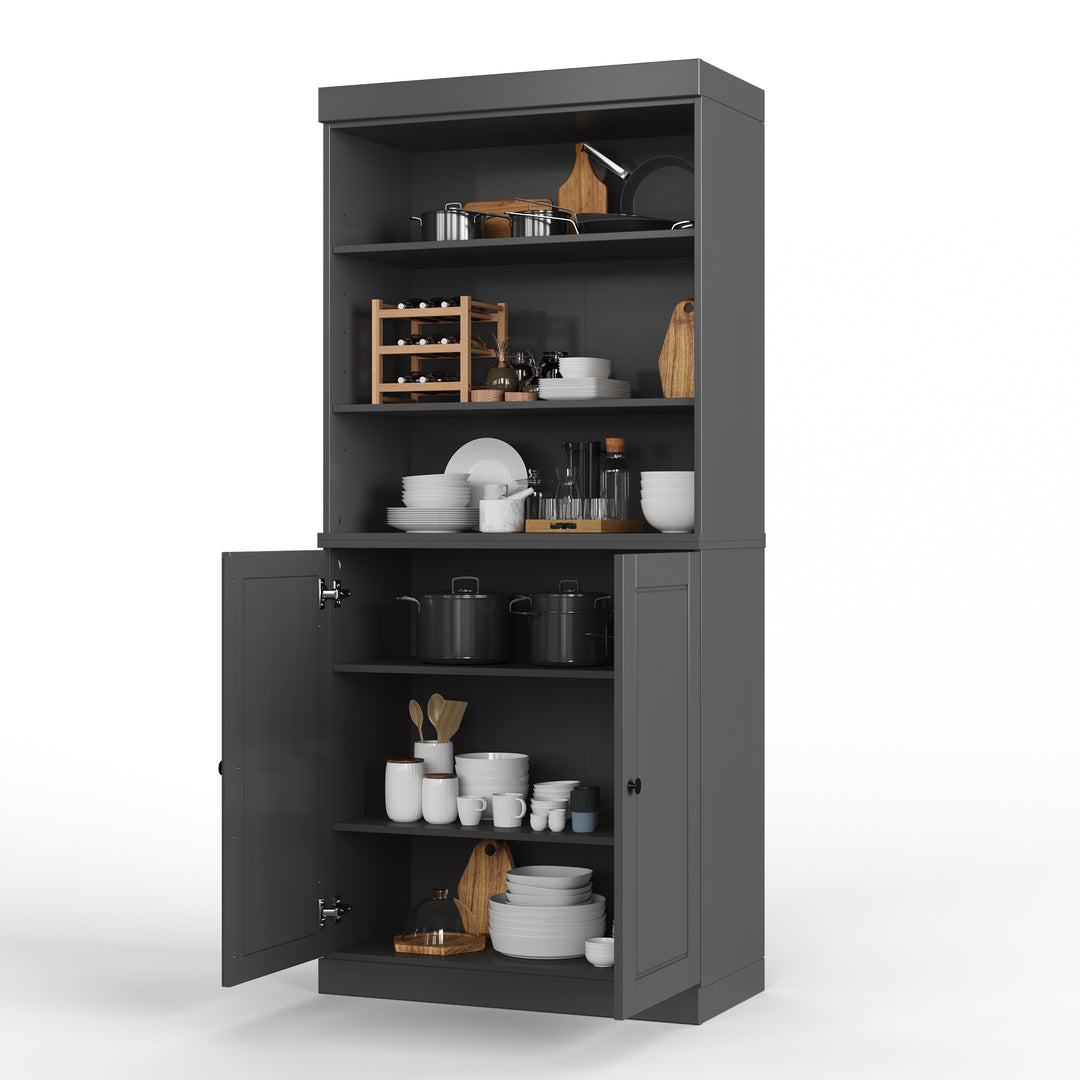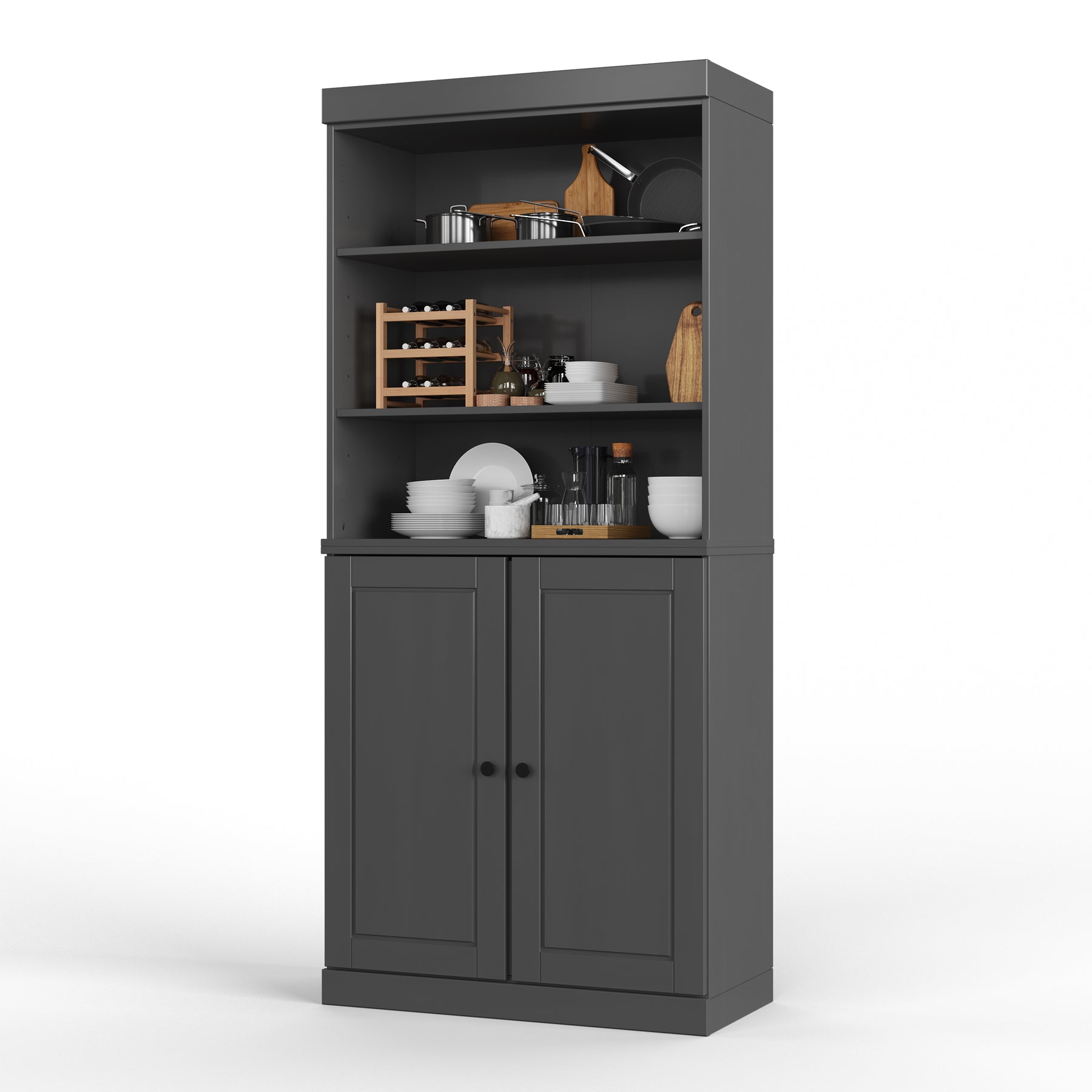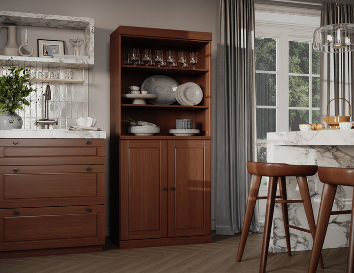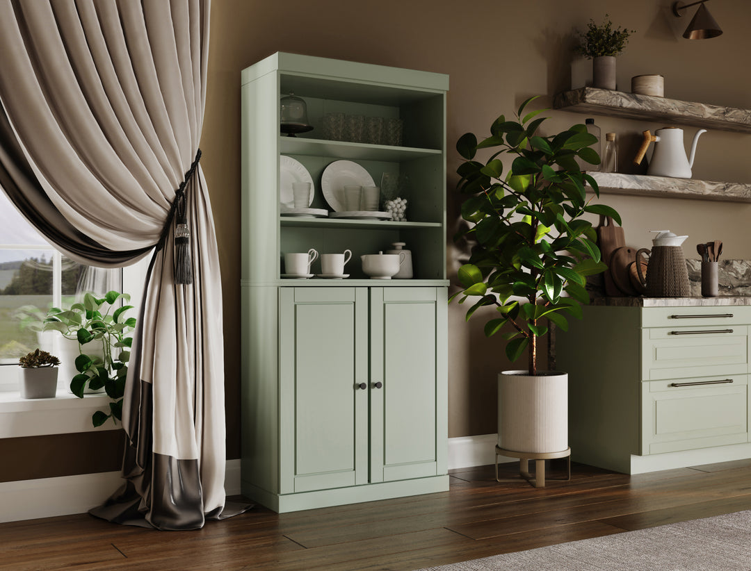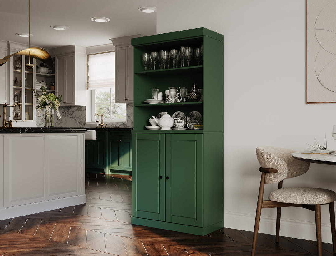 Crafted from premium solid wood, this pantry exudes natural beauty and sturdiness, bringing warmth and charm to your kitchen. Its thoughtful design includes four adjustable shelves, easily tailored to accommodate your storage needs, from pantry staples to taller kitchen essentials. Need even more space? Add extra shelves as your collection grows. Select from clear glass doors for an elegant showcase, frosted glass for subtle sophistication, or raised panel wood doors for a classic, concealed look.