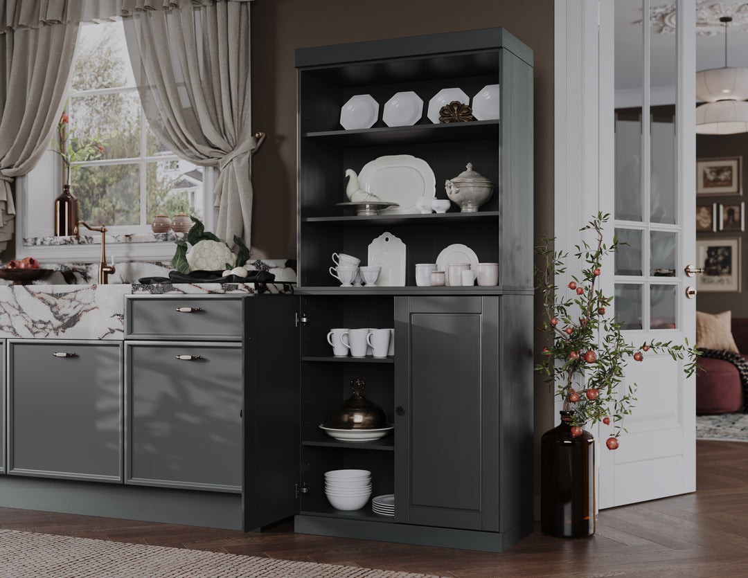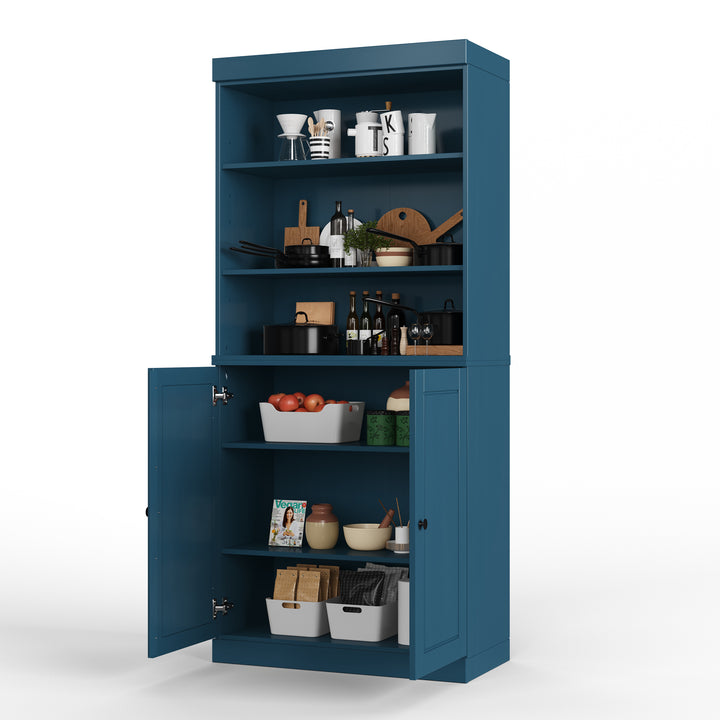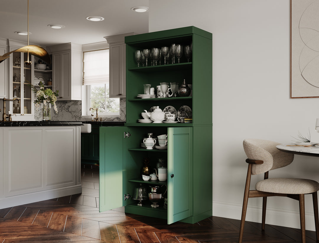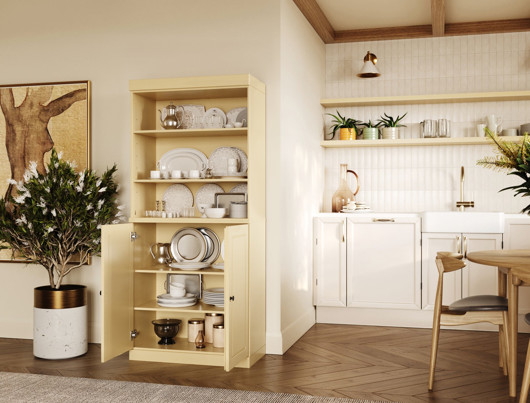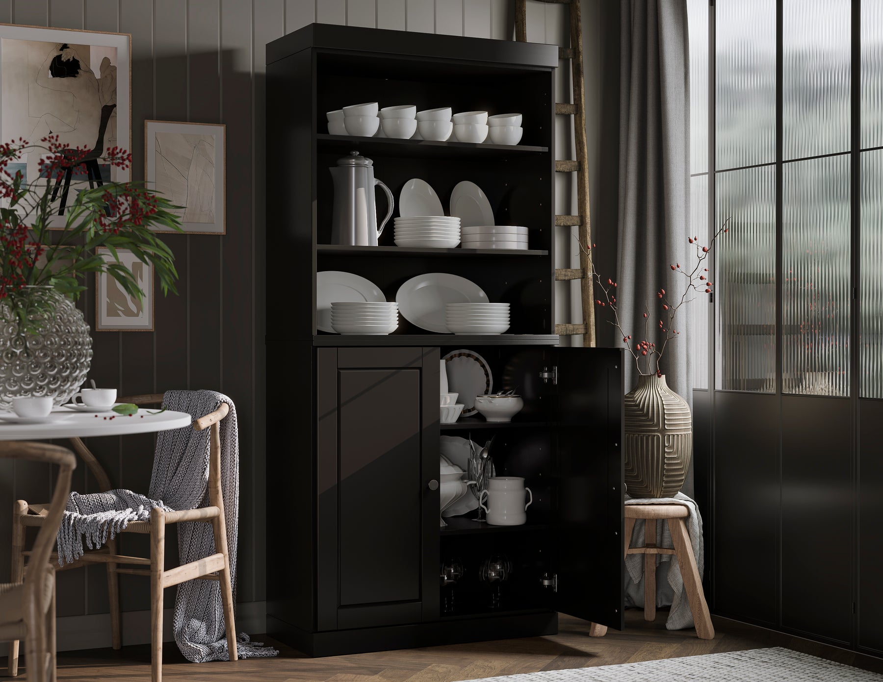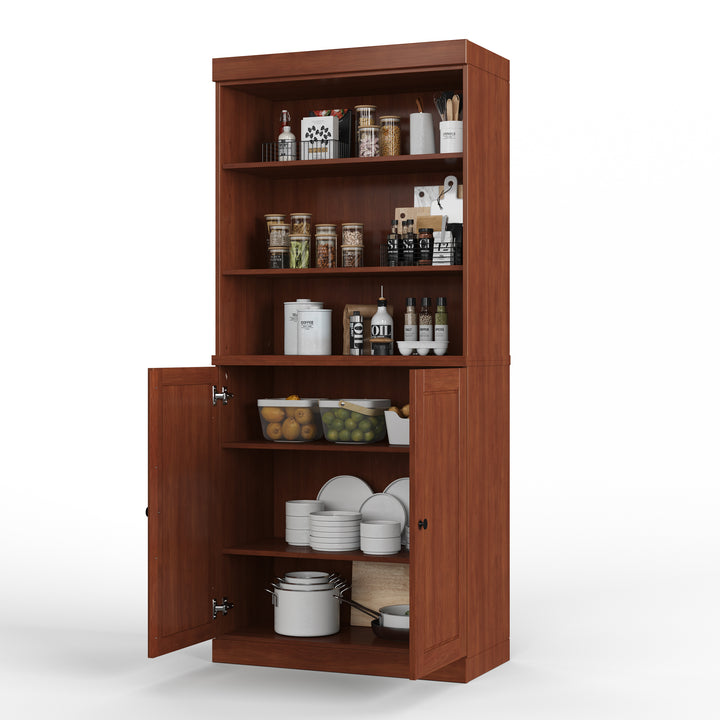 Crafted from premium solid wood, this pantry exudes natural beauty and sturdiness, bringing warmth and charm to your kitchen. Its thoughtful design includes four adjustable shelves, easily tailored to accommodate your storage needs, from pantry staples to taller kitchen essentials. Need even more space? Add extra shelves as your collection grows. Select from clear glass doors for an elegant showcase, frosted glass for subtle sophistication, or raised panel wood doors for a classic, concealed look.