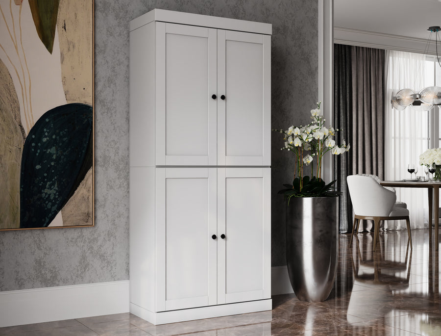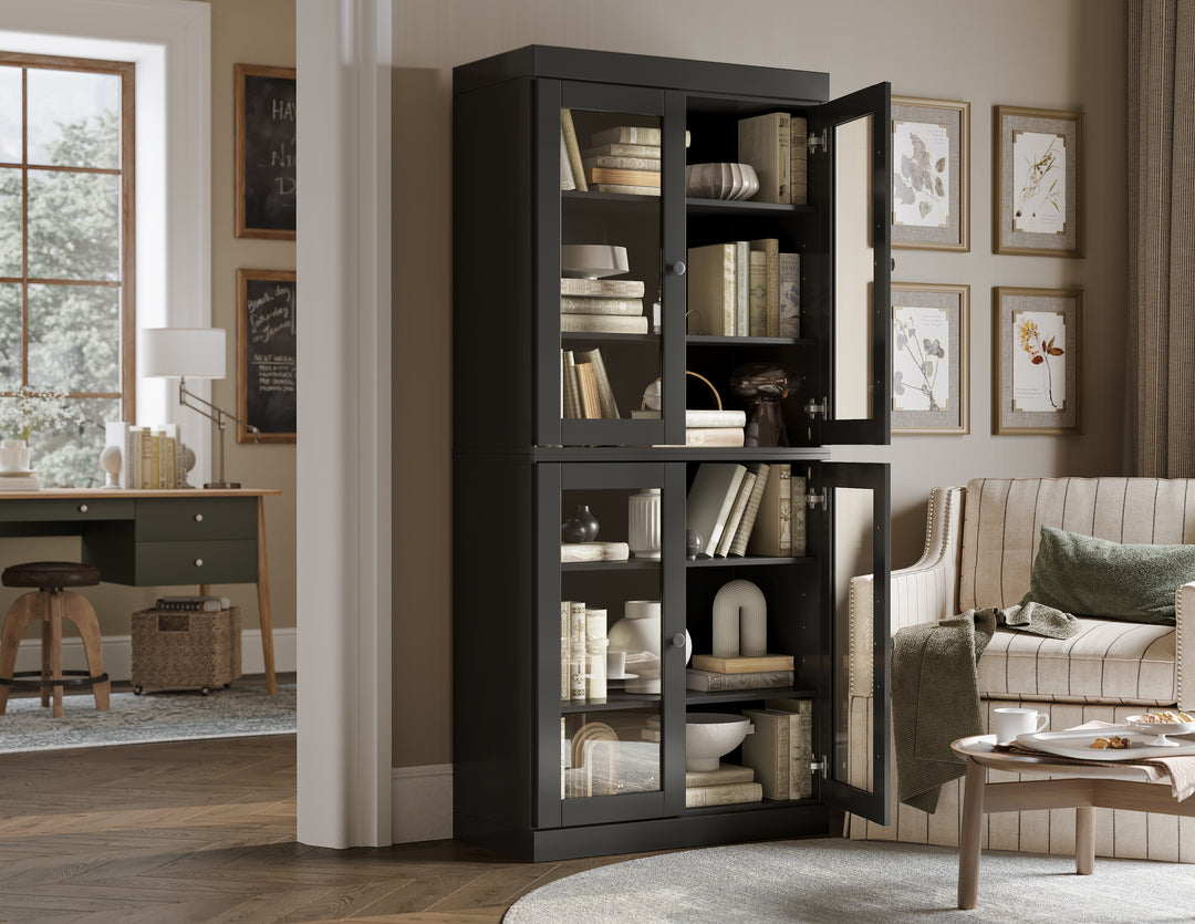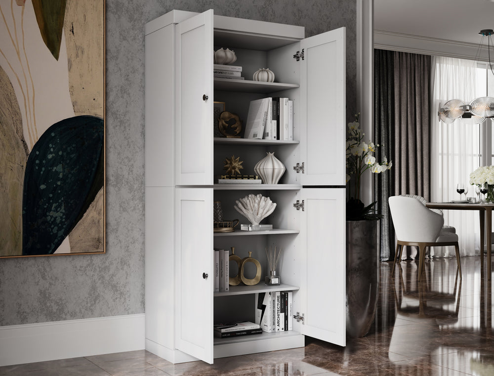 - 4 removable and adjustable shelves with 16 metal pegs included