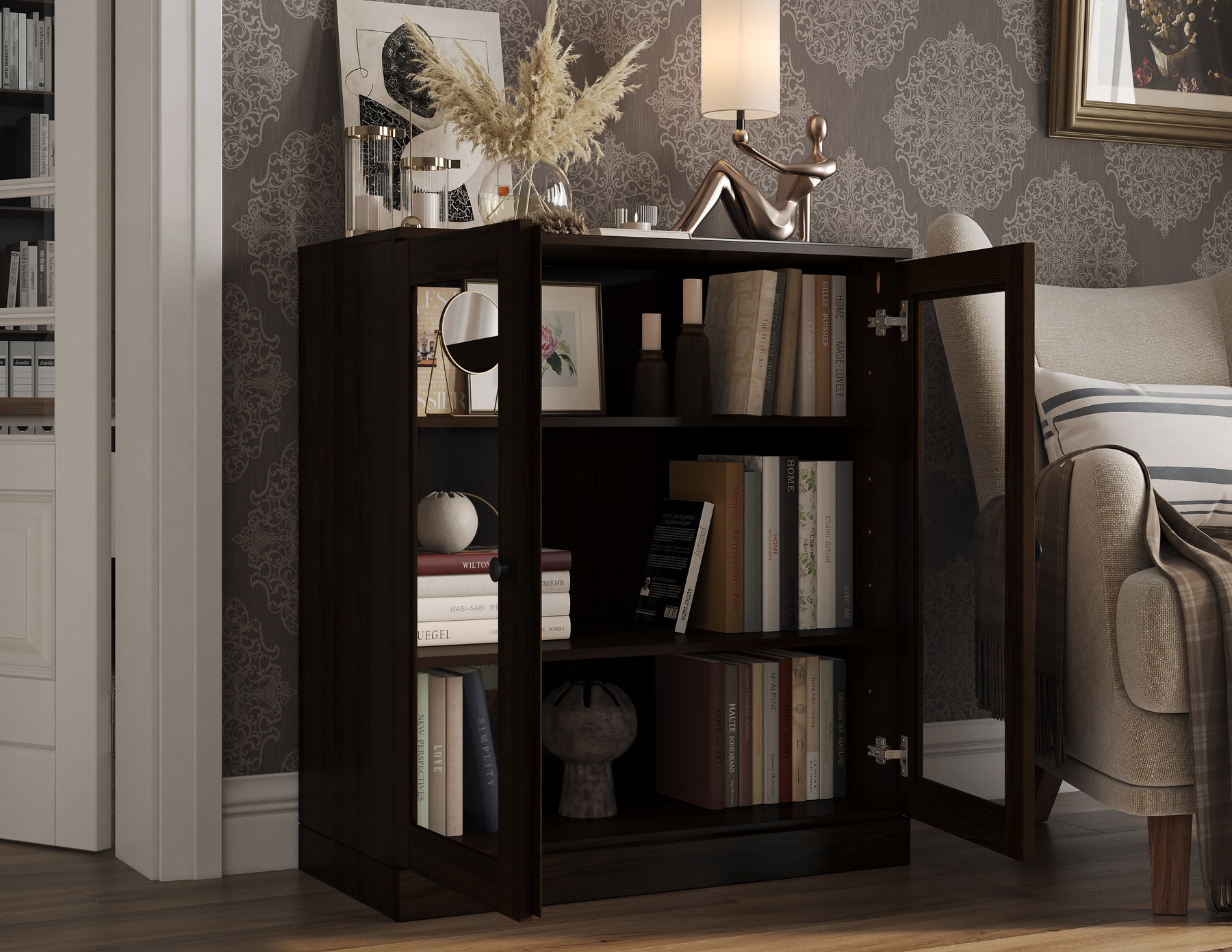 With two adjustable shelves to fit items of varying heights and a sleek closed-back design, this bookcase is ideal for your home office, living room, or bedroom. The clear glass doors showcase your items while keeping them organized. Whether used as a bookcase, storage cabinet, display unit, or shoe rack, it's a perfect choice for enhancing living space, especially in smaller areas like apartments, condos, and dorm rooms.