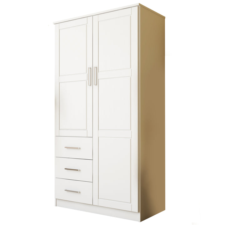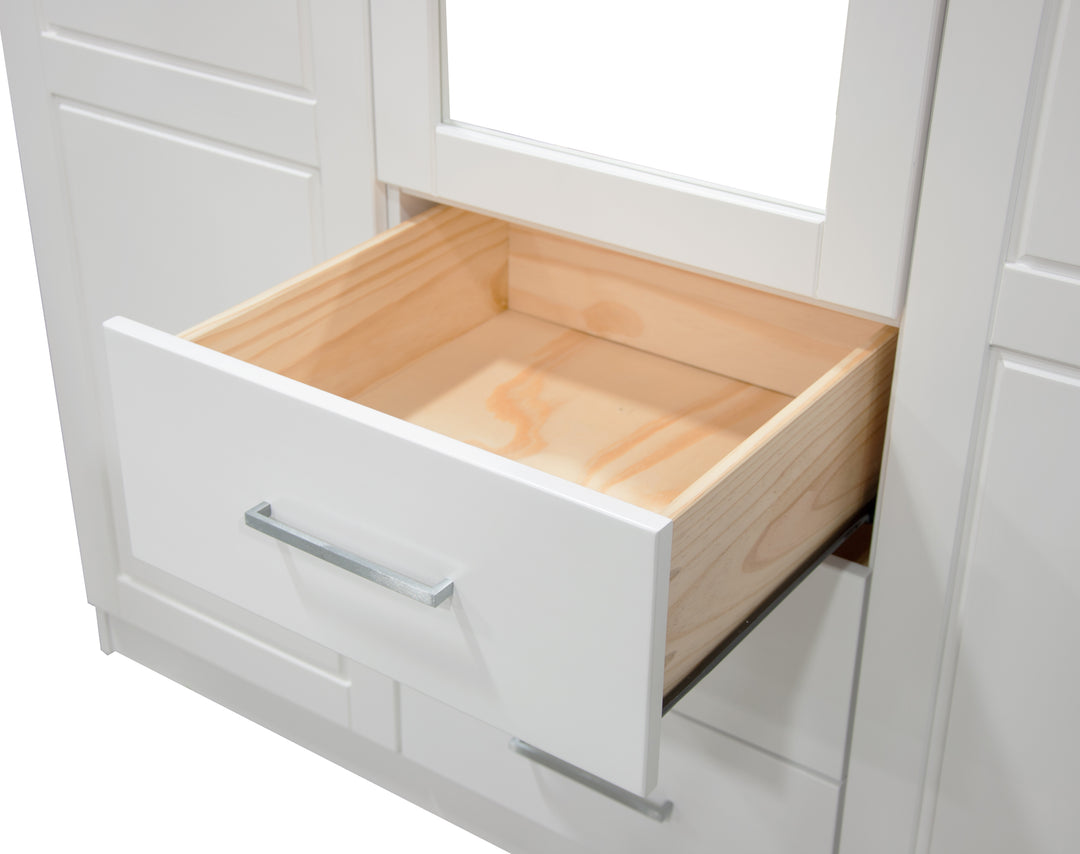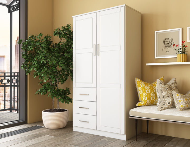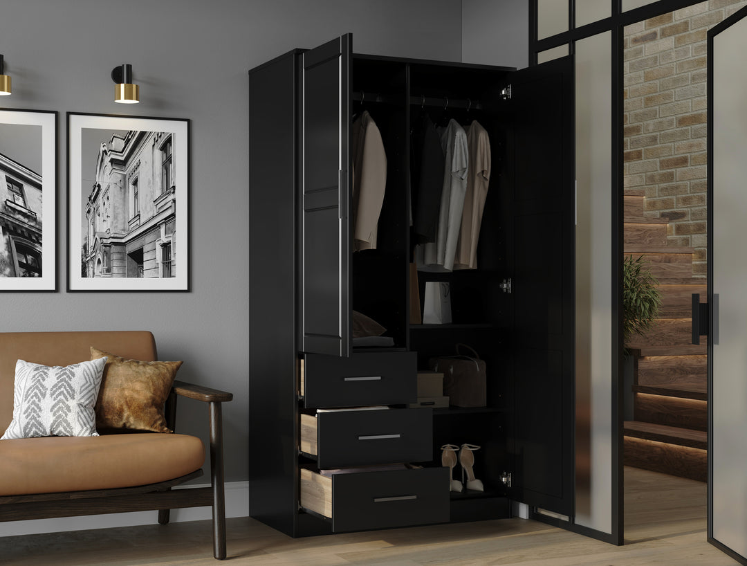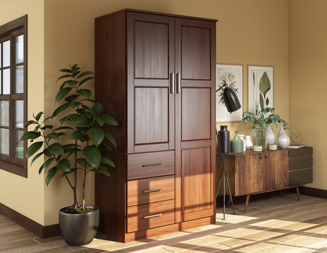 This 100% Solid Wood 2-door Metro Wardrobe Armoire will solve all of your storage needs. At almost 38 inches in width, it offers enough volume for many kinds of items! It comes with 2 shelves, but to compartmentalize it further, optional shelves can be purchased for a total of 6. Whether you keep your possessions tidy or not, they will be hidden behind beautiful solid wood raised panel doors with or without a mirror on soft-closing Euro hinges. If modern looks, straight lines, and aesthetic simplicity accentuated by metal hardware appeal to you, look no further and get this Made in Brazil beauty today! 3- and 4-door Cosmo versions are available as well.