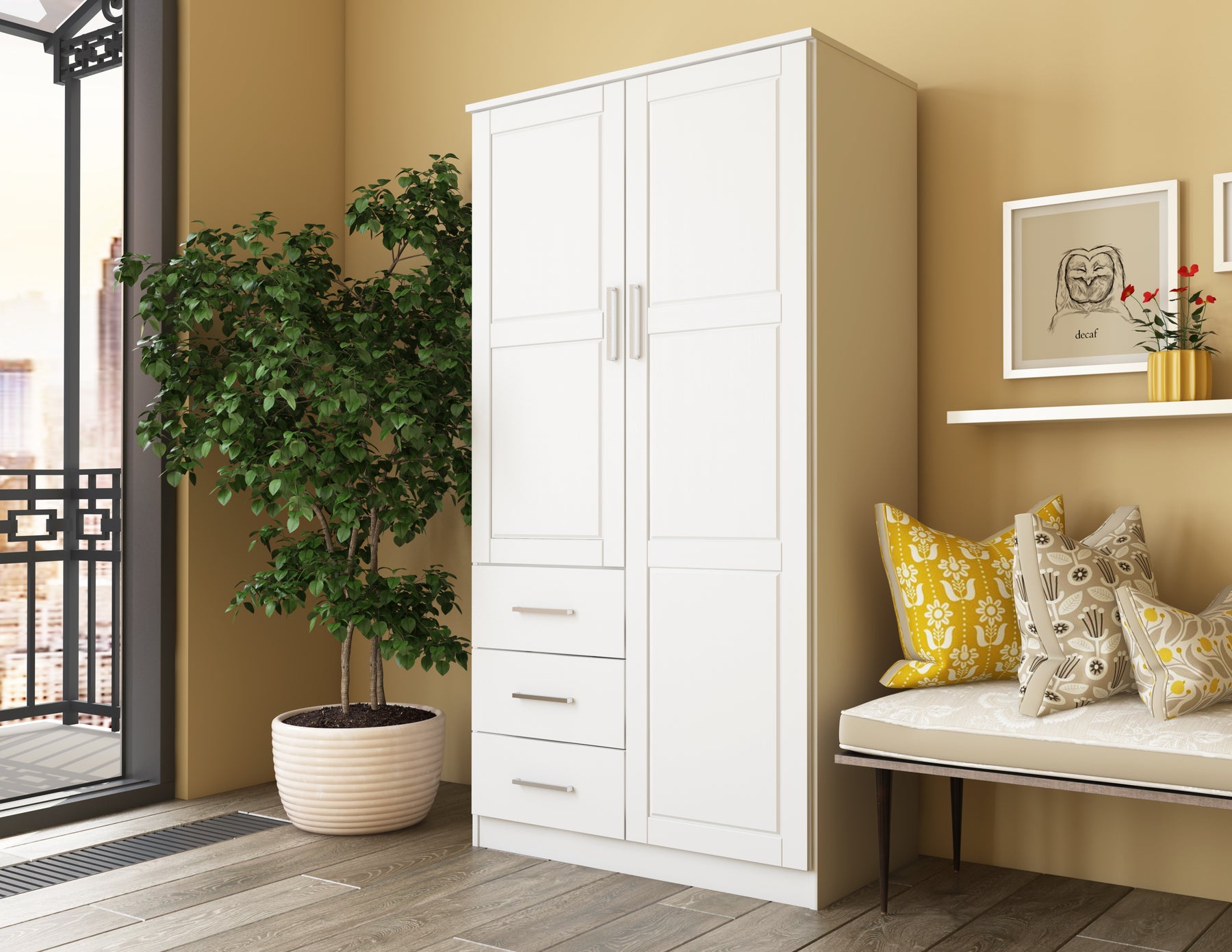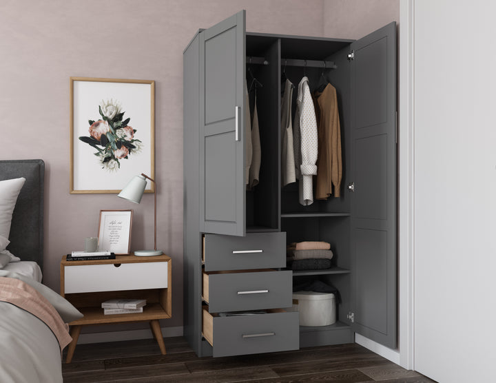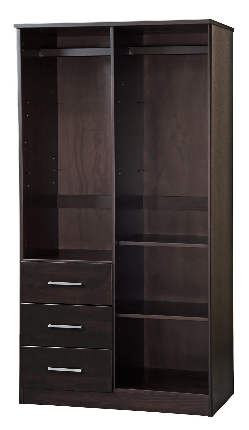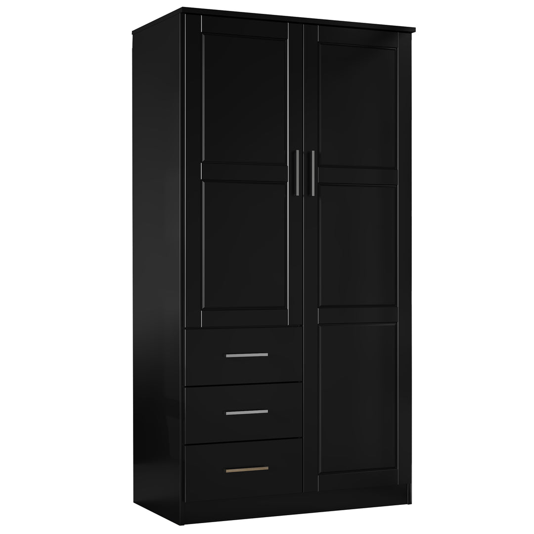 This 100% Solid Wood 2-door Metro Wardrobe Armoire will solve all of your storage needs. At almost 38 inches in width, it offers enough volume for many kinds of items! It comes with 2 shelves, but to compartmentalize it further, optional shelves can be purchased for a total of 6. Whether you keep your possessions tidy or not, they will be hidden behind beautiful solid wood raised panel doors with or without a mirror on soft-closing Euro hinges. If modern looks, straight lines, and aesthetic simplicity accentuated by metal hardware appeal to you, look no further and get this Made in Brazil beauty today! 3- and 4-door Cosmo versions are available as well.