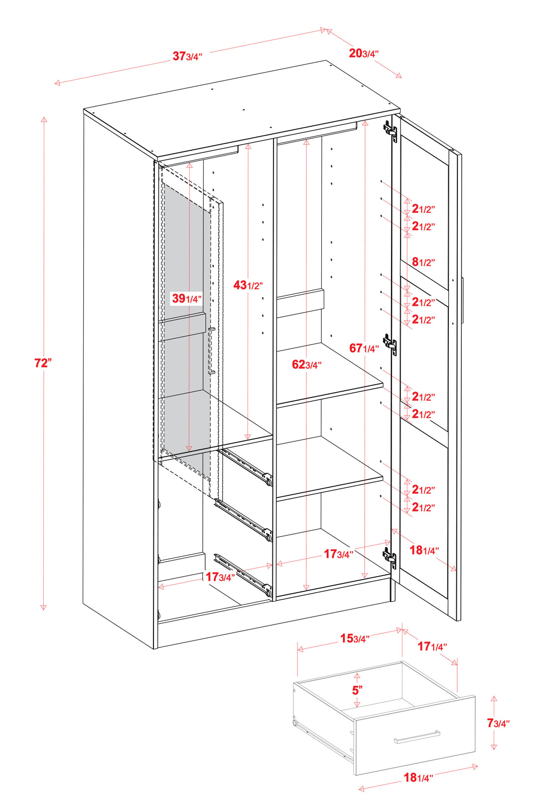 Overall Size: 37.75"w x 72"h x 20.75"d