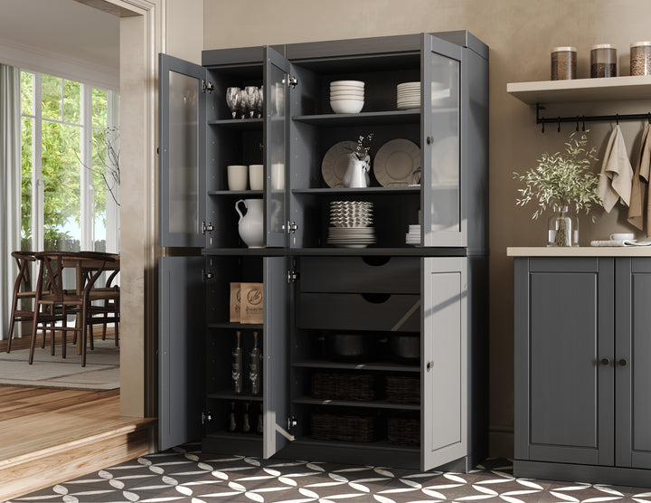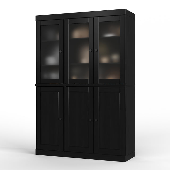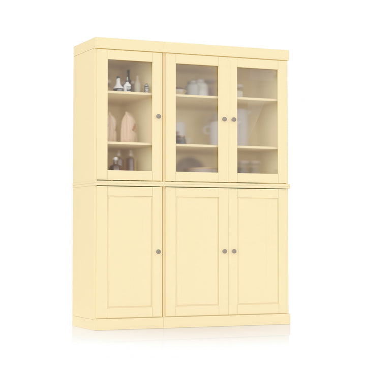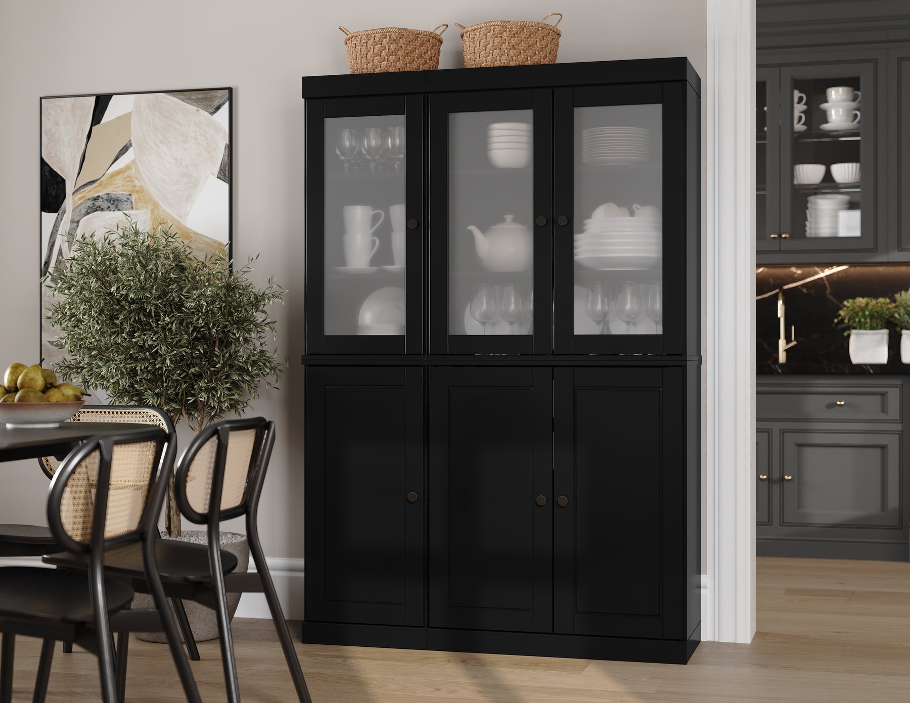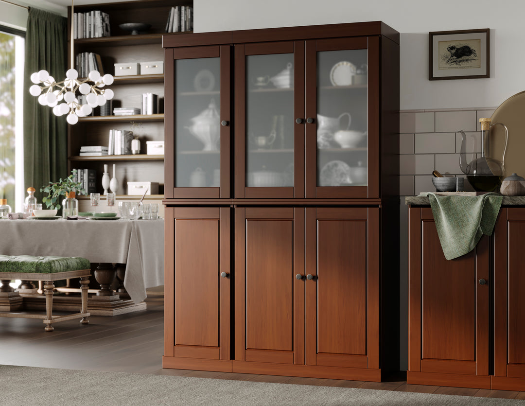 This 100% solid wood 48.5"‐wide pantry china cabinet is a perfect solution to your kitchen storage and display needs! Within easy reach and with all adjustable shelves, it will store various items regardless of their size. Frosted glass doors will showcase your wares while the raised panel solid wood doors will hide an occasional clutter. One 2-drawer organizer, which is perfect for smaller loose item, is included, but the unique design of this "create your own pantry" allows you to add multiple 2-drawer kits or replace glass doors with wood ones and vice versa. You can even turn it into 2 sideboards completely redesign it with 7 basic modules. Get this Made in Brazil solid wood pantry today and make your kitchen sparkle!